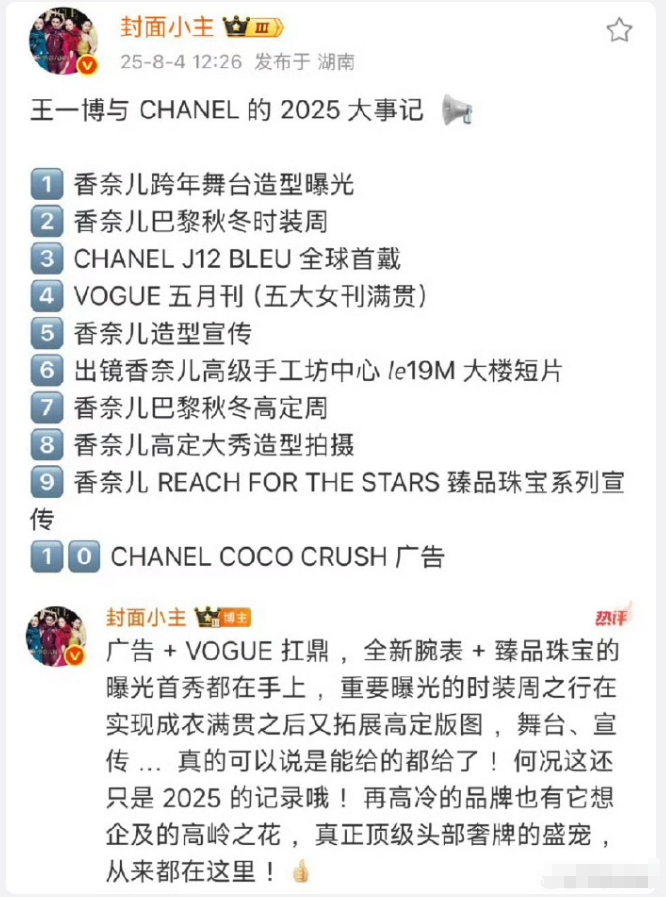 全球第一位男星广告大片,头排看秀,臻品珠宝,登上VOGUE,五大开季,五大金九,五大周年,限量系列全球首戴,他的代言数量和质量本来就是内娱最强的,他代言的黑狮刚刚续约,开启合作的第五年,就连竞品奢牌也都为他妥协了,在商务代言上,他确实到顶了,当然,再上身一套香奈儿高定更好了。
