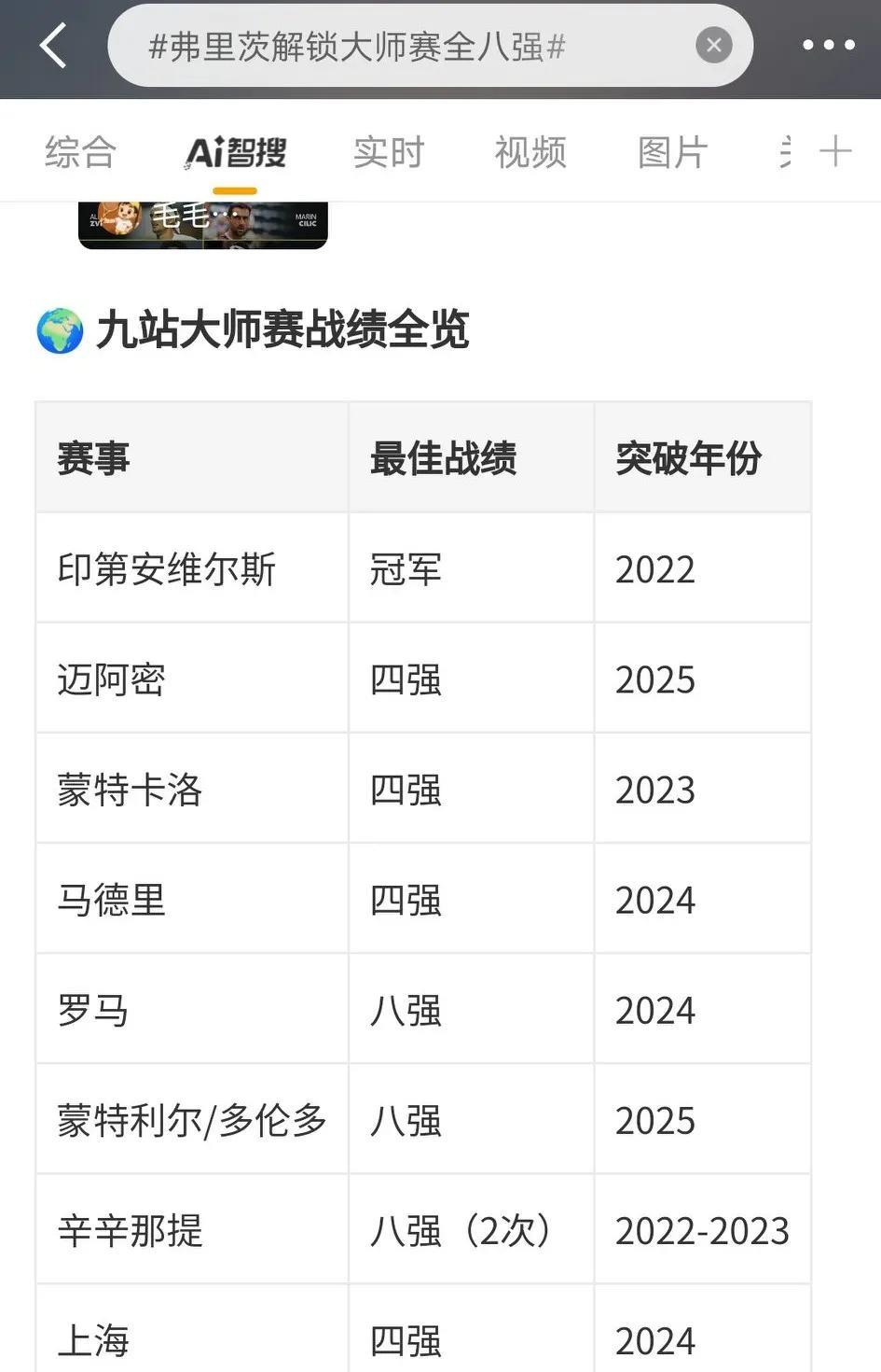 没想到辛纳还没有解锁大师赛全八强!现役有11位球员达成此成就: 弗里茨、德约、阿