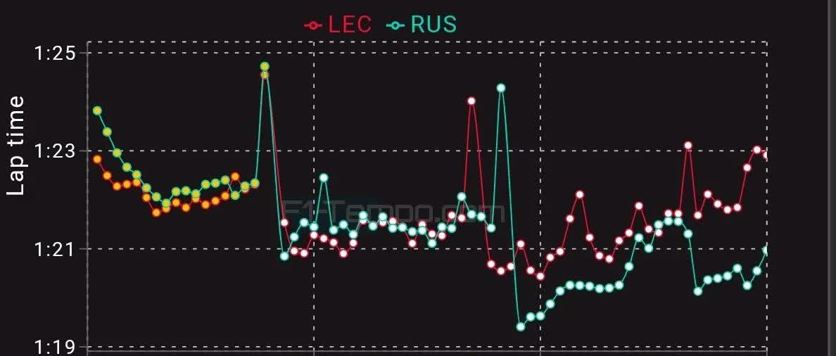 法拉利有意掩饰赛车的问题? 拉塞尔在接受天空体育的采访时谈到勒克莱尔在本场比赛遭遇的问题,他说:“我看到他的速度有多慢,所以我猜测他的赛车有些地方出问题了,我们唯一可以想到的是他的行车高度设定太低了,必须在二停增加胎压,因为他们运行了一个低引擎模式,让引擎在大直道末端慢下来,那里是底板磨损最大的地方。他不会告诉你他们接近违规,根据圈速和引擎模式,这是我们唯一能想到的。” 法拉利给出的理由是底板开裂,但看勒克莱尔的车载并没有看到他压到路肩或其他碎片,遥测数据确实看出法拉利赛中把引擎模式调低了,主要是最高转速的部分,所以法拉利在低下压力调教的情况下尾速反而比迈凯伦还要低