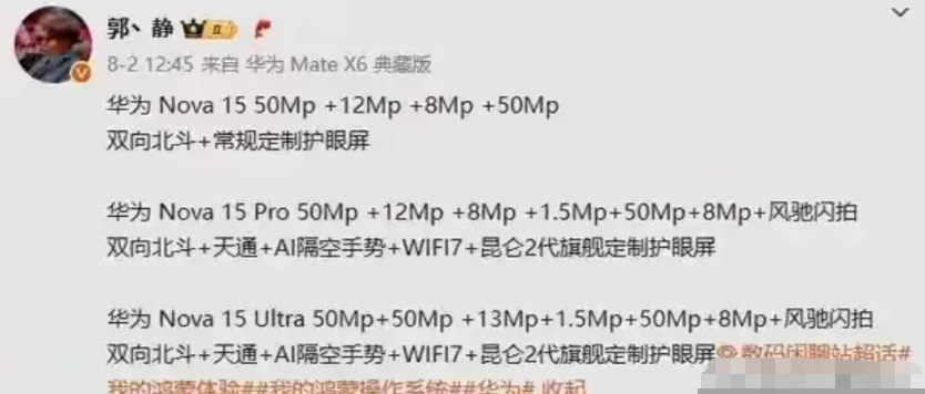 nova15系列又要迎来大升级了,鸿蒙6.0系统+8030,还有如风驰闪拍、双向北斗天通、AI隔空手势、WIFI7、昆仑2代旗舰定制护眼屏、还有大电池,这些功能以前基本都是mate系列和Pura 系列才有的。 现在为了把纯血鸿蒙推广,快速提升纯血鸿蒙的用户量,不仅把这些功能全部下放,而且最新系统推送也不比mate和Pura 迟。