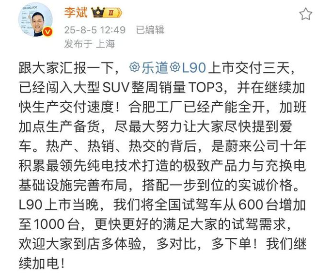 孙少军: 上周乐道L90只用三天就交付了1976辆!
