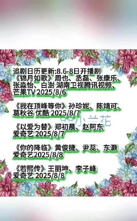 速看!8.6 - 8日开播剧清单来了 追剧日历更新!《锦月如歌》等多部剧定档,周也、王丽坤等明星主演,登陆湖南台、优爱腾等平台,不同题材满足多样喜好,剧迷们码住~