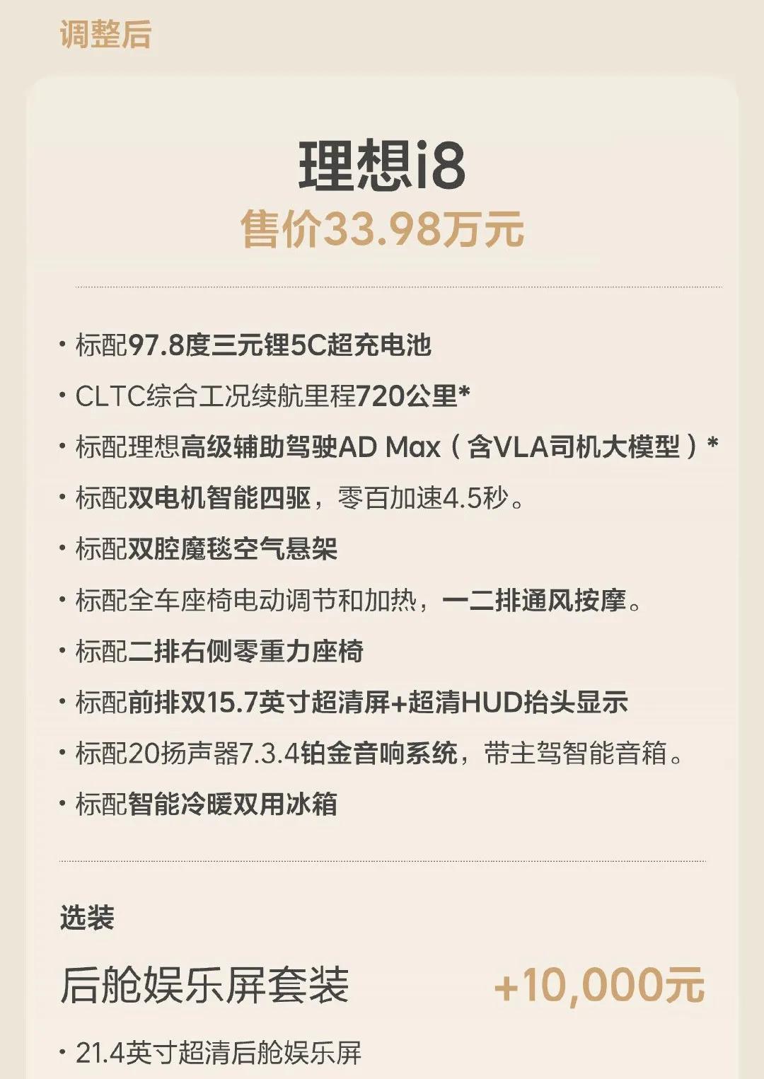 理想i8“听劝版”来了! 这款上周发布的纯电SUV风波持续不断,本周又有新动向: 紧急降价砍车型,保留一款车型,33.98万元,可选后舱娱乐屏套装 理想汽车CEO李想透露i8小订超过3万辆