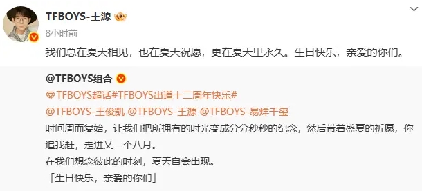 王俊凯、王源、易烊千玺卡点发文庆祝出道十二周年。