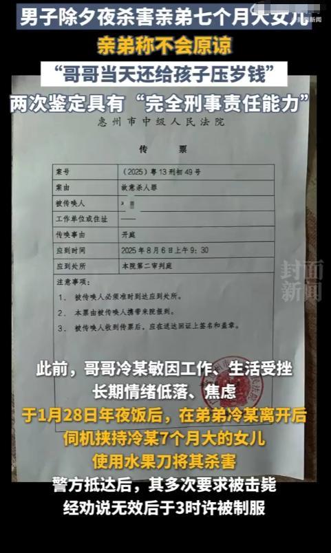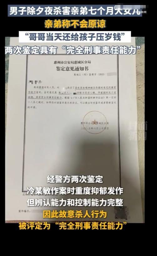“精神病不是违法的挡箭牌!”弟弟喜得一女,过年时专门将患有抑郁症的哥哥,接来家里吃年夜饭,热闹一下。却不想哥哥嫉妒弟弟阖家美满,趁弟弟外出时,直接拿刀将才7个月大的侄女杀害。弟弟悲痛欲绝:当天哥哥刚给孩子发完压岁钱,他为什么这么做? 8月4日,广东一对哥俩可谓是两个极端,哥哥因为工作、生活长期受挫,情绪低落、严重焦虑,因此怎么都走不出负面情绪,患上了严重的抑郁症,虽长期服用药物,但哥哥的症状仍旧不见缓解,发病的时候多次萌生自我了解的念头。 而弟弟就不一样了,有着一个善解人意的妻子,在去年的时候两人还生下了一个可爱的女儿。哥哥有抑郁症当弟弟的也愁的不行,为此没少开解哥哥,可效果都不好。 眼看要过年了,1月28日就叫哥哥来吃年夜饭,为此还专门叫来了父母,想着可能一家人坐在一起,热闹一下,哥哥的心理就会好受一点。 当天中午他们一起吃了午饭,哥哥还给小侄女包了一个红包,弟弟觉得这是一个好迹象,证明哥哥心中还是有亲情的,有亲情就会有牵挂,也就不会总想着要自我了解了。下午的时候,弟弟开始准备年夜饭,就和老婆一起有说有笑的,他们抱着孩子场面十分温馨。 可是这一幕却深深的刺痛了哥哥,他觉得自己的人生这么惨,为什么同样是亲兄弟弟弟就这么幸福?当天晚上吃完年夜饭的时候,哥哥陷入这个情绪当中无法自拔。遂趁着弟弟外出的时候,拿着一个水果刀就将弟弟不过7个月大的女儿给杀害。 妈妈看到这一切之后,赶紧下楼找弟弟,顺便找保安的帮助。而父亲上前阻止未果,哥哥在杀害了侄女之后,又挟持了亲生父亲。后来警察赶到现场,哥哥情绪的崩溃,一直在强调赶紧击毙他。警察判断哥哥的行为属于抑郁症发作时期的特点,经历了3个小时耐心的劝解,哥哥伏法。 看着空荡荡的家里,弟弟崩溃,他不知道哥哥为什么要这么做,自己的孩子明明这么小?他怎么下的去手。警察找到弟弟表示,如果愿意出具谅解书,再加上抑郁症,那么哥哥有可能会被从轻处罚,可是弟弟拒绝了,他绝不和解。 弟弟从来没有想过因为哥哥的病症,将他的家庭拉入了地狱。他不知道该怎么面对这个哥哥,只希望司法能公正审判,给他的孩子一个说法。