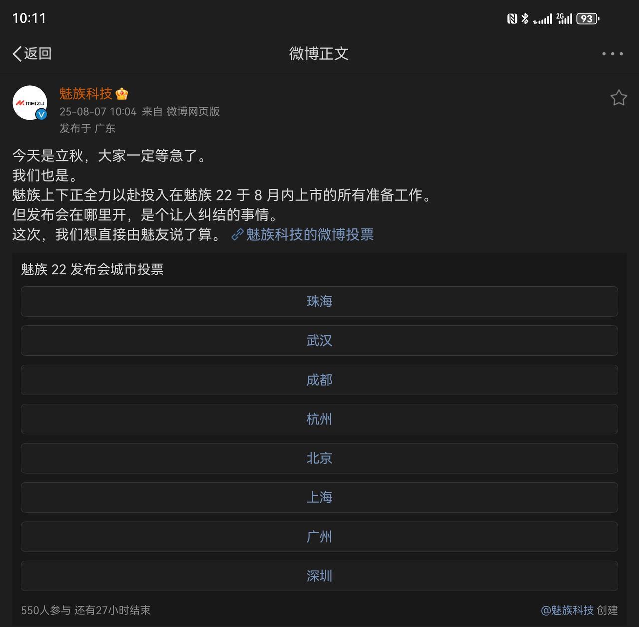 8月7日魅族22确认8月内上市,然而魅族说现在还没有定发布会城市,还开了个投票让
