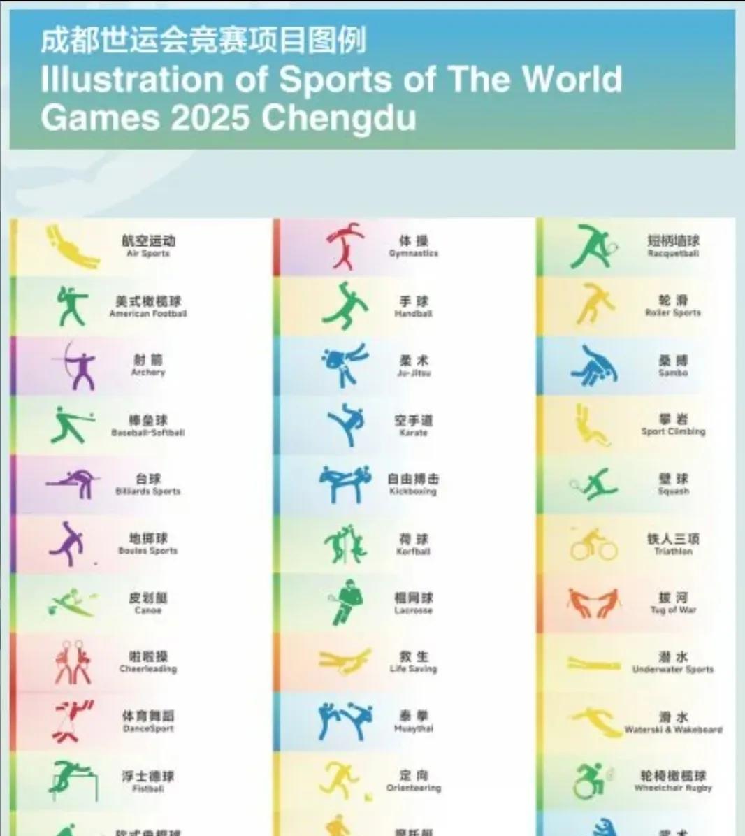 第十二届世界运动会在成都如期开幕。 世界运动会,是由国际世界运动会协会主办的一项国际性体育盛会,竞赛项目以“非奥运会项目为主”。 成都世运会的30个正式比赛项目分别为:空中运动、射箭、台球、地掷球、皮划艇、体育舞蹈、浮士德球、软式曲棍球、飞盘、沙滩手球、柔术、踢击、荷式篮球、棍网球、水上救生、泰拳、定向越野、短柄墙球、壁球、垒球、攀岩、武术、蹼泳、体操、空手道、力量举、拔河、轮滑、滑水,以及将首次亮相世界运动会的桑搏。 这些项目都挺新奇的,绝大部分都和平时电视里转播的奥运会项目、各种锦标赛、世界杯之类的,不一样。非常具有观赏性,充分体现了本届世运会的口号:“运动无限,气象万千”!