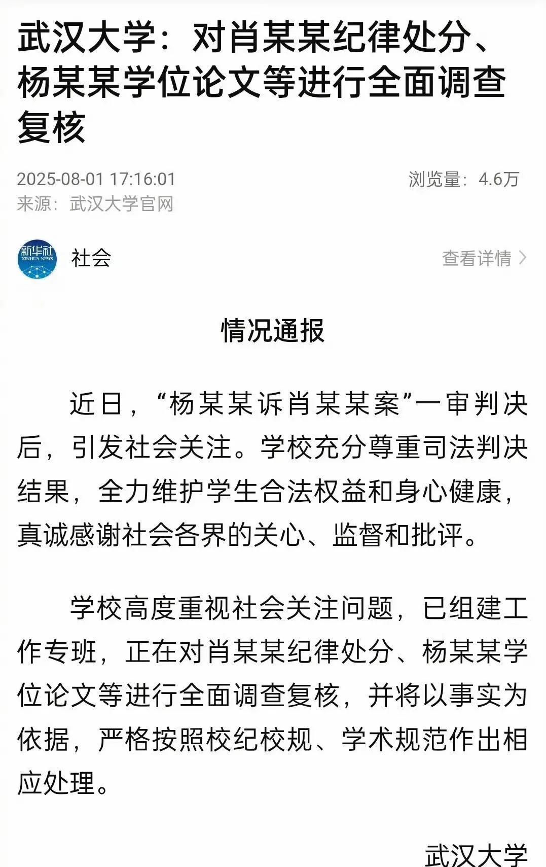 武汉大学自从8月1日,发了个“通报”,说是要全面复核杨景媛的学位论文和肖同学的纪