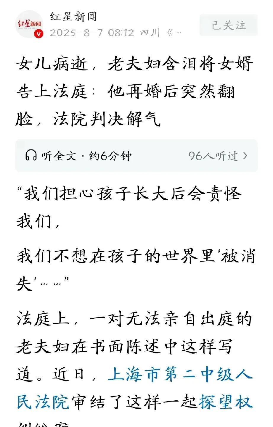 上海,女子突然病逝后,女婿续弦另娶,还把唯一的孩子带走。孩子是女子的父母一手抚养长大的,更是倾注了对女儿的关爱和思念,她们只想能多陪陪孩子。结果,女婿却突然翻脸,各种理由不让女子父母探望。女子父母告上法庭后,法院的判决非常解气。 8月7日,据红星新闻报道,王女士离世后,女婿周先生开始拒绝让王女士的父母探望外孙,双方为此还闹上法庭。 2011年,王女士和周先生满怀期待地登记结婚,开启了他俩的婚姻生活。 可命运弄人,王女士身体不太好,一直没能有孩子。看着别人家孩子嬉笑玩耍,夫妻俩心里满是失落,四处奔波求医。 好在2017年,通过试管技术,他们终于迎来了儿子小周。 那一刻,一家人乐开了花,王女士更是激动得热泪盈眶,终于体会到了当母亲的滋味。 因为王女士身体缘故,小周出生后,外公王大爷和外婆李大妈就主动挑起了照料外孙的重担。 两位老人把小周当成心头宝,含在嘴里怕化了,捧在手里怕摔了,看着小周一天天健康长大,老人觉得日子有了盼头。 然而,命运再次无情地打击了这个家庭。 2018年,王女士不幸因病去世。这消息如晴天霹雳,王大爷和李大妈悲痛欲绝,白发人送黑发人,那种痛苦无法言表。 他们把对女儿的爱,全都倾注到了外孙小周身上,希望小周能健康快乐地长大。 时间来到2021年9月,周先生再婚了,王大爷和李大妈虽然心里有些失落,毕竟女儿走了。 可他们也明白人生还长,希望周先生能幸福。他们真心地为周先生高兴,想着只要小周能过得好就行。 可周先生再婚后,小周的抚养方式发生了变化。周一至周五,小周和父亲一起生活,周末则被外公外婆接到家里。 周先生还特意嘱咐,不要跟小周说母亲去世的事,要让小周叫继母妈妈。 王大爷和李大妈听了,心里像被刀割一样难受,觉得这是在抹去女儿在世上的印记。 但他们又想到,孩子还小,不能让他承受太多痛苦,为了外孙的身心健康,他们还是忍着悲痛同意了。 可到了2024年1月,因为对小周教育问题的分歧,周先生竟然不让两位老人见孩子了。 这可把王大爷和李大妈急坏了,女儿走了,外孙就是他们全部的希望,是他们在这个世界上最亲的人,不能见孩子,相当于断了他们对生活的念想。 2024年7月,实在没办法的两位老人和周先生签了份协议书,约定他们有探望小周的权利,每月最后一个周六16时,周先生把小周送到约定地点交给他们,当天20时再接回去。 可协议签了,却始终没能见到孩子。他们心急如焚,无奈之下,只好把周先生告上了法庭。 对此,法院会如何判决呢? 一、非直接监护人在一定条件下,也可以主张探望权。 《最高人民法院关于适用〈中华人民共和国民法典〉婚姻家庭编的解释(一)》第六十七条规定:未成年子女的父母或者直接抚养子女的一方拒绝协助另一方行使探望权的,人民法院可以依法采取执行措施。 司法实践中,若未成年人的父或母一方死亡,且祖父母、外祖父母与孙子女形成事实抚养关系的,可参照上述规定主张探望权。 本案中,小周自出生至母亲去世后,长期由外祖父母王大爷、李大妈实际抚养,双方形成了深厚的情感依赖关系。 外祖父母虽非法定监护人,但实际承担了小周的生活照料与情感陪伴,已成为事实上的家庭成员,其探望权可基于未成年人利益最大化原则主张。 协议约定“每月一次、每次四小时”的探望方式未影响小周正常生活,且外祖父母始终隐瞒生母去世真相以维护孩子心理健康,体现其对未成年人利益的充分考量。 二、违反协议拒不协助探望的行为不仅不诚信,更是违法的。 《民法典》第五百七十七条规定:当事人一方不履行合同义务或者履行合同义务不符合约定的,应当承担继续履行、采取补救措施或者赔偿损失等违约责任。 周先生与外祖父母签订的《探望权协议》明确约定:每月最后一个周六由周先生送孩子至约定地点,该协议具有合同效力。 协议系双方自愿签订,内容未违背法律强制性规定,应认定合法有效。 周先生未按约定送孩子、故意回避探望,既违反《民法典》合同编规定,也违背《家庭教育促进法》第二十条关于父母不得拒绝其他监护人对未成年人的关心、爱护的要求。 若周先生仍拒不履行,法院可依据《民事诉讼法》第二百五十二条对其采取罚款、拘留等强制措施,或通过社区协助、司法训诫等方式督促执行。 三、法院作出公正判决。 综上,一审法院判决王大爷和李大妈有探望小周的权利,探望时间和方式按照之前约定的来,周先生要协助行使探望权。 周先生对判决结果不服,提起上诉,请求法院改判每月只能探望小周一次,每次两小时,而且探望地点由他来定,还必须要小周同意才行。 结果,二审法院审理后,依法驳回周先生的上诉,维持了一审原判,王大爷和李大妈这才把心放到了肚子里。