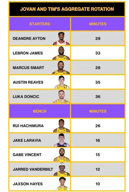 JovanBuha更新社交媒体,晒出对于湖人新赛季轮转时间的预测。 其具体为: