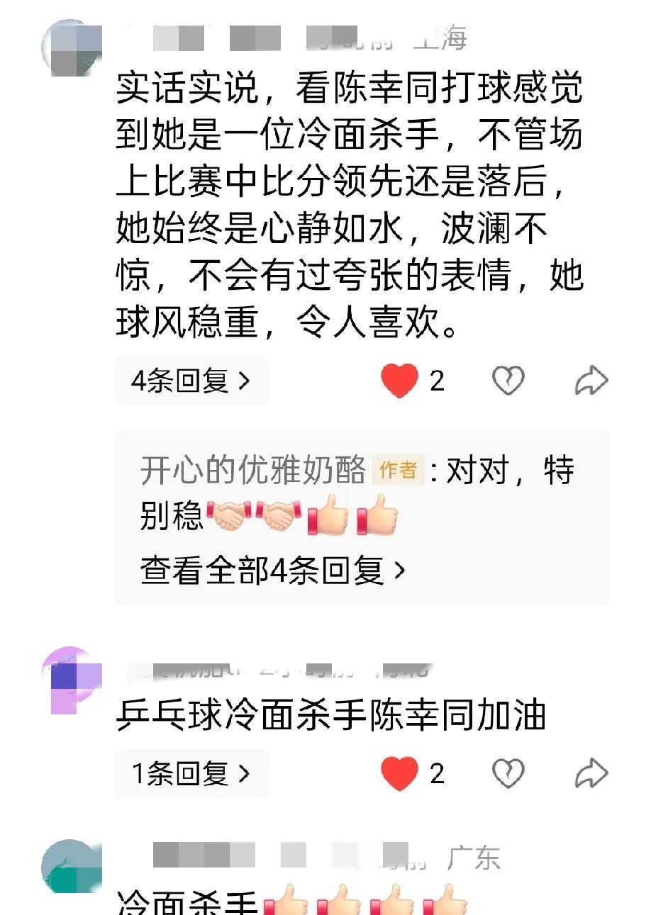 有说陈幸同是冷面杀手,我觉得是佛系女孩。 陈幸同采访就说,每一站的比赛就只是一个比赛,对我来说都是一样的,就是全力以赴去打每一场比赛。 同同这样说的也是这样做的,和队友比赛时都会适可而止,和王艺迪的仁川冠军赛,明明就要赢了,最后输了球迷都意难平,而同同就是云淡风轻。 同同就是佛系女孩,打外协能把张本美和打哭,内战就完全摆烂,零封也无所谓。 同是闺蜜曼昱就不一样,大满贯又打出个陈熠,绝对有曼昱姐的风格。 所以,在大环境不好时,同同绝对人间清醒,私下就开开心心美美哒。 图片来自网络侵权可删。 #头号创作者激励计划#