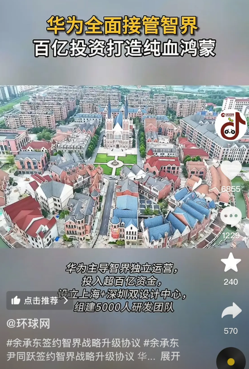 今天,华为与奇瑞签订重磅协议,华为全面接管智界,斥资超百亿在上海和深圳设立双设计中心,组建5000人的研发团队,打造纯血鸿蒙。重庆的赛力斯是最早与华为合作造车的,而且深度放权给了华为,成就了问界汽车,创造了新能源汽车的神话。 这一次奇瑞也要效仿赛力斯,可能会把智界系列打造成与问界一样的辉煌,让鸿蒙系统深度融合到新能源汽车上,万物互联!