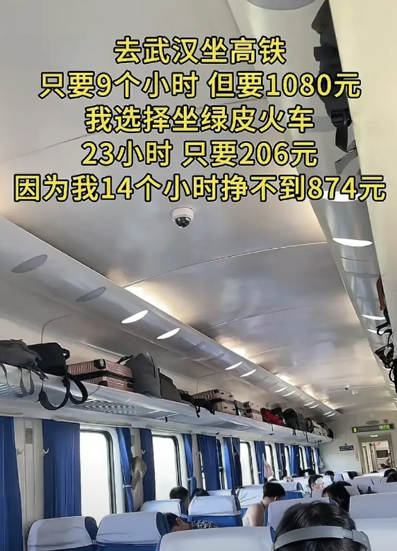 去武汉坐高铁,只要9个小时,但要1080元,我选择坐绿皮火车23个小时,只要206元,因为我14个小时挣不到874元。 偷偷告诉你们,这种长途,坐绿皮火车卧铺比高铁舒服多了。 只要不是赶时间,只要有绿皮的情况下,我首选绿皮,因为我喜欢这种悠哉悠哉的感觉,当你透过车窗望向车外,山川湖泊也在看你! 我赞同她这样的做法,毕竟普通人14小时是不可能挣到874块钱的,也就是说坐14小时的绿皮赚了874块钱,我也觉得挺好的,874块钱做为普通家庭能办好多事情