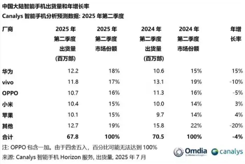 两方面可做参考,一方面,Canalys的2025年第二季度国内手机出货量榜单上,哪家的市场份额增长最多?