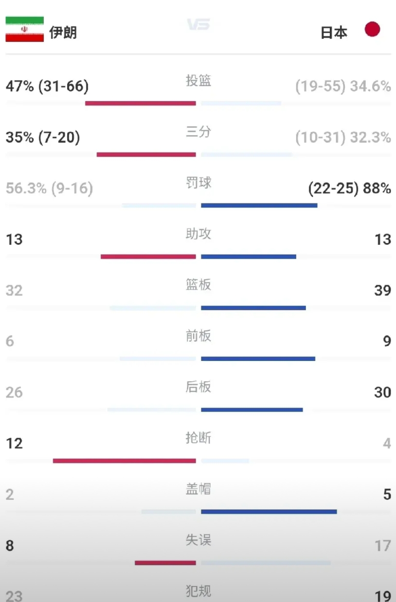 日本70:78输伊朗,波斯铁骑再现江湖! 说实话,真的没想到日本会败,其实日本一直都是掌控局面的那一方,奈何第四节突然断电,让伊朗打了个11:0,最终比赛失去了悬念。 还有一点没想到,日本一向引以为傲的投射竟然被伊朗比了下去,无论是两分球命中率还是三分球命中率都被伊朗压制,这就难怪日本会输球了。 这下局面有意思了,日本有无法出线的可能性,就看后续他们的发挥了!