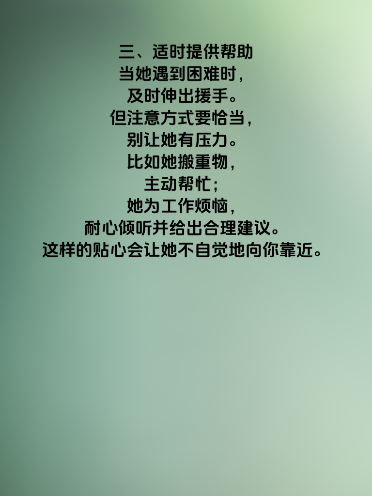 一、展现真实魅力,想要让女生主动靠近,首先要展现出最真实的自己。不必刻意伪装,真诚才是打动人心的法宝。比如,在她面前大方分享自己的兴趣爱好,无论是热爱的运动,还是独特的收藏,都能让她看到一个鲜活有趣的你。 二、保持适当距离,别一味地紧追不舍,保持适当距离会让她对你更有好奇心。给彼此一些空间去做自己喜欢的事,偶尔的小神秘反而能增加她主动靠近你的欲望。比如她在忙工作时,你默默支持,等她有空时再自然交流。 三、适时提供帮助,当她遇到困难时,及时伸出援手。但注意方式要恰当,别让她有压力。比如她搬重物,主动帮忙;她为工作烦恼,耐心倾听并给出合理建议。这样的贴心会让她不自觉地向你靠近。 四、制造共同回忆,一起去做一些有趣的事,创造难忘的回忆。无论是看一场浪漫的电影,还是去郊外徒步,这些共同经历会在她心中留下深刻印记,促使她更愿意主动和你相处,靠近你温暖的世界。