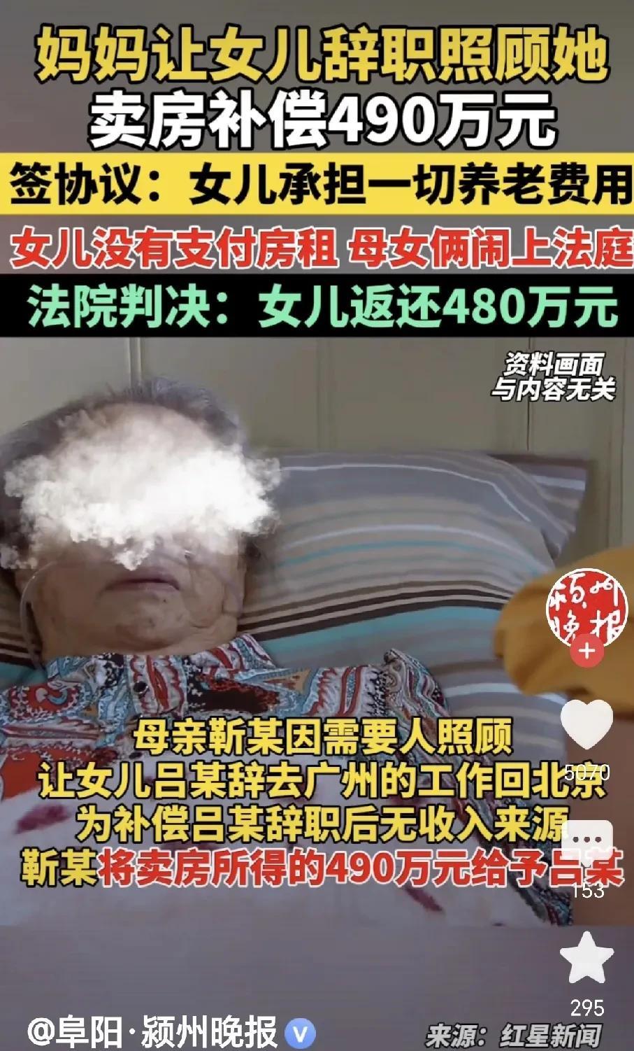 工作没了,钱没落着,谁的错?北京,一女子在外地工作,母亲老了,要她辞职回家照顾,女子为难,如果回去,就没了收入,大妈为补偿女儿,把房子卖了,490万卖房款转到女儿账户,大妈和女儿签下协议,她一切开销,全由女儿负责,谁知女儿回来,不愿和她一同居住,只给她租了套房子,偶尔过去照顾,买点好吃好喝,偶尔再买件衣服,大妈大失所望,交房租时,大妈住了三个季度,女儿只肯交一个季度,剩下两个季度,要母亲自己支付,大妈彻底心凉,一纸诉状告到法院,要求女儿返还490万,法院这样判了! 2025年8月8日,据阜阳·颍州晚报报道了一件母子之间纠纷,令人唏嘘。 靳大妈悔之晚矣,她把自己的房子卖了,卖房款490万元,全部打到女儿账户。 明明说好,自己一切费用,都由女儿负责,可是如今她租房子,就连房租,女儿都不肯支付。 她没了退路,房子没了,钱也没了,女儿不孝,大妈大哭。 原来,靳大妈有一套房子,一个女儿,女儿长大,到广州工作。 广州离北京太远,女儿很久都不能回来一次。 靳大妈的老伴,早些年已经去世,她也越来越老,身体状况每况愈下。 靳大妈怕了,怕独自一人,万一有个头疼脑热,身边没人照顾,于是,她给女儿打去电话,要她辞职,回来照顾自己。 女儿吕女士在电话那头,听到母亲的要求,瞬间就摇了摇头,她告诉母亲,如果辞掉工作,她就没了收入。 这么多年的打拼,全部都要付之东流,她的事业也会半途而废。 现在她给母亲养老,她就不能工作,挣不来钱,那她自己将来老了,又要依靠什么? 靳大妈一听,女儿说的不错,于是,她就做出决定,她要把自己住的这套房子卖了。 2021年4月,房子成功卖出,她和女儿说好,卖房款全部给到女儿手里,女儿辞职回来照顾,以后她的所有开支,全部都由女儿支付。 吕女士一想,这主意不错,比上班钱多,她立刻辞职,回到了母亲的城市。 卖房款490万元,靳大妈全部打给进了吕女士的账户。 谁知吕女士拿到钱后,并没有和母亲住在一起,而是给她租了套房子,俩人各住各的。 吕女士没事过来看她,会给她买些好吃好喝,偶尔买件衣服,也会让靳大妈高兴半天。 靳大妈没有过多要求,无论如何,女儿总算回到了自己的城市。 这个时候,母子俩相处不错,2023年12月1日,大妈和吕女士签下赡养协议。 大妈要求,生养死葬,全由女儿吕女士负责,大妈所有费用,都由吕女士支付。 2021年7月~2023年7月,两年的房租,吕女士全部给予了支付。 可租房住了两年,大妈又想去养老院了。 她听人说,养老院里有护工照顾,一日三餐都有人做好送到跟前。 最重要的是,那里都是同龄老人,能说到一起,不会再孤单 寂 寞。 吕女士拗不过她,退了房子,把母亲送到了养老院里。 吕女士一次缴了20万元,希望母亲能在里好好生活。 可等住了进去,靳大妈发现,养老院和传说中的根本不一样,没了自由,还要按照养老院的作息生活。 老人之间,也会发生矛盾,靳大妈不高兴了,只住了5个月,她就要回来。 吕女士交的20万元,除去那5个月的费用,养老院都给退了,退回来的钱,都给到了靳大妈手里。 出来之后,吕女士又租了一套房子,大妈住了三个季度,催促女儿把房租缴了。 可是,女儿只给了她16200元,用来支付2024年最后一个季度的租金,前面两个季度,女儿没给她支付。 吕女士说,养老院退回来那么多钱,都在靳大妈自己手里,完全可以支付前两个季度的房租。 靳大妈不愿意了,虽然退了一部分的钱,总归是个少数。 靳大妈又说,明明俩人签了协议,自己一切费用,全由女儿吕女士承担,她的房租,该由吕女士全部支付。 吕女士就是不给,你自己有钱,你自己交了再说! 靳大妈心里凉透,她后悔了,房子卖了,钱给出去,由不得自己做主了。 于是,她将女儿告到法院,要求女儿返还490万元。 《民法典》第26条第2款规定: 成年子女对父母负有赡养、扶助和保护的义务。 吕女士对母亲靳大妈负有赡养义务,不能因任何原因而免除。 《老年人权益保障法》第20条规定:经老年人同意,赡养人之间可以就履行赡养义务签订协议。 靳大妈与女儿签订的协议,具有法律效力,对双方具有约束力,女儿应按协议约定承担母亲的全部养老费用。 《民法典》第663条第1款规定:受赠人有下列情形之一的,赠与人可以撤销赠与:(二)对赠与人有扶养义务而不履行。 靳大妈将490万卖房款赠与女儿,是以女儿履行赡养义务为前提,属于附义务的赠与。 女儿未按照协议约定支付母亲的房租,构成对赠与合同所附义务的违反,靳大妈有权主张撤销赠与。 一审判决,吕女士应返还靳大妈490万元。 吕女士不服上诉,二审发现,靳大妈实际给女儿转了480万。 二审改判,吕女士应返还靳大妈480万。 对此,你怎么看?关注@王哥说法 学法律知识。#头号创作者激励计划#