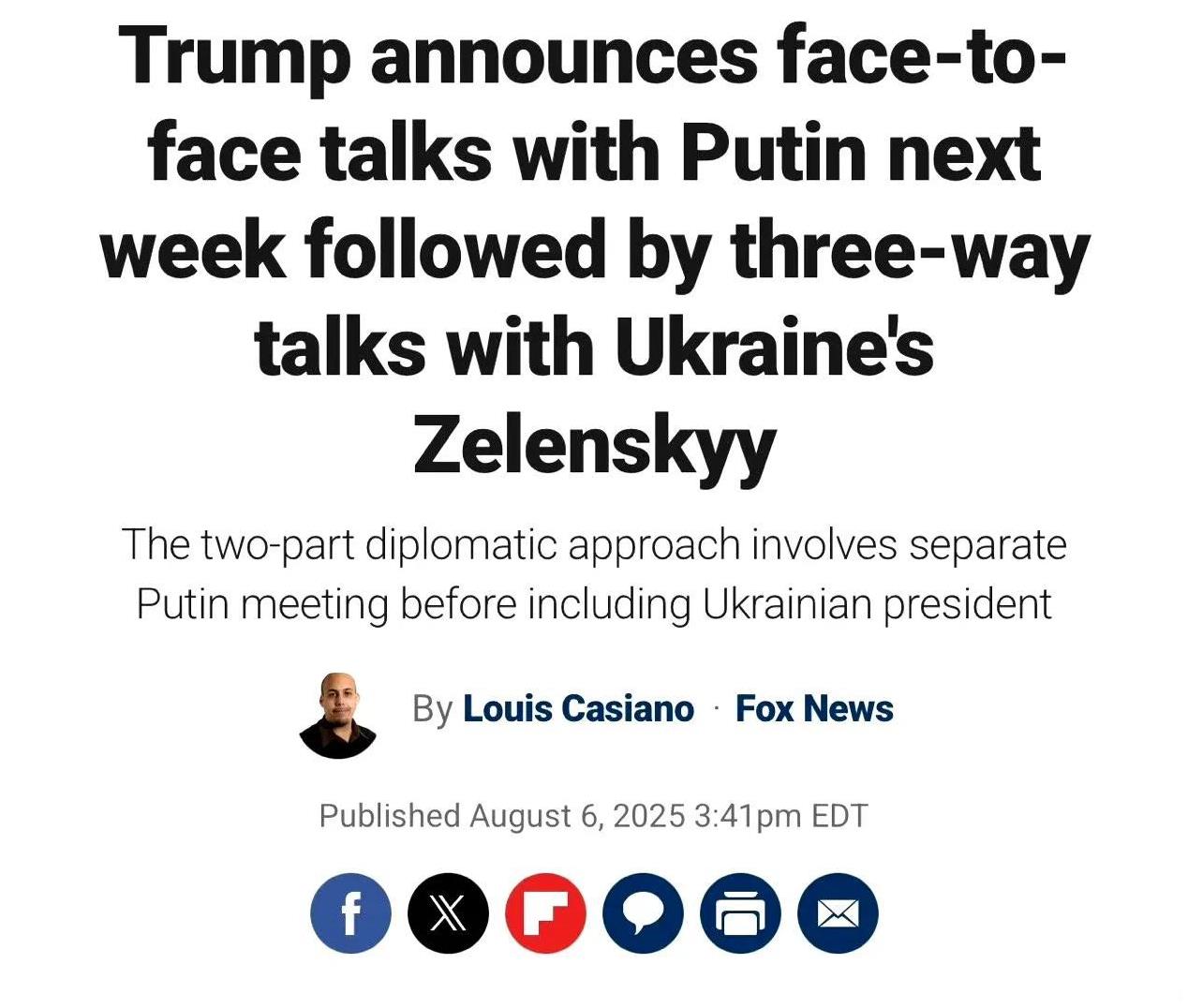 Trump会见Putin,8月15,阿拉斯加 克宫确认:美俄首脑,下周会晤,正在找合适的地点。没有确认美俄乌三方会谈,俄总统认为:见Zelensky的时机还不成熟。 昨日,Trump宣布:下周与Putin见面,然后美俄乌三方首脑会谈 讨论乌克兰问题,却拒绝乌克兰参与,难怪泽连斯基问,“这合理吗?”。