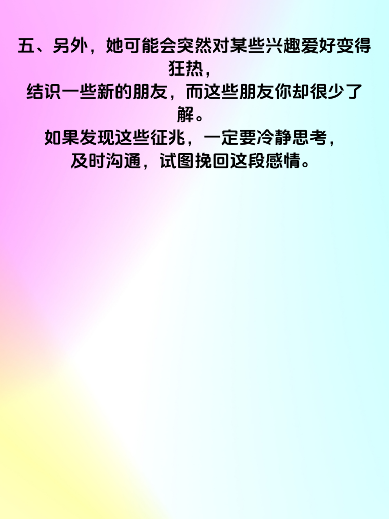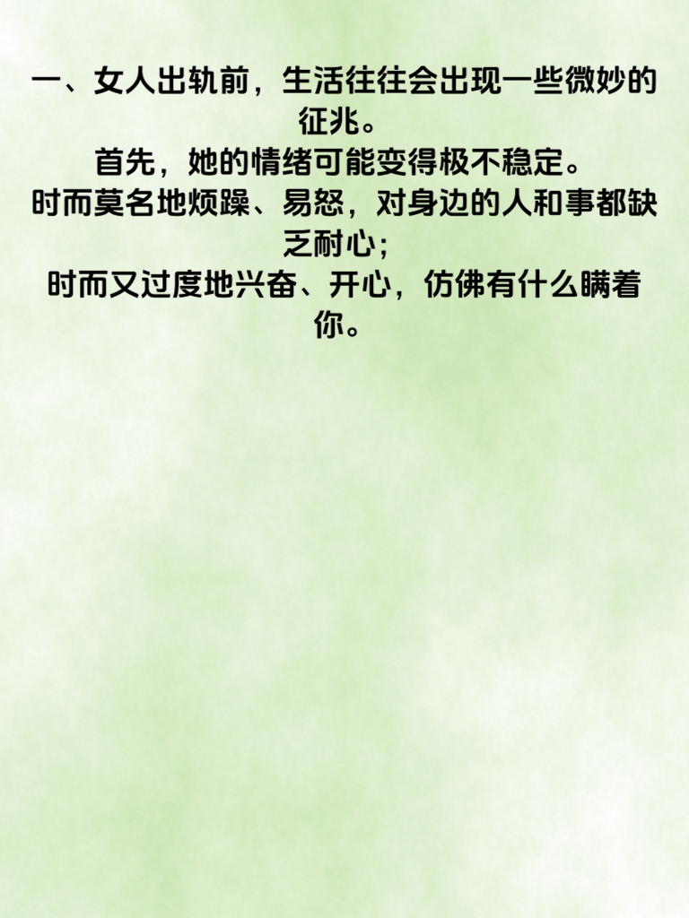 一、女人出轨前,生活往往会出现一些微妙的征兆。首先,她的情绪可能变得极不稳定。时而莫名地烦躁、易怒,对身边的人和事都缺乏耐心;时而又过度地兴奋、开心,仿佛有什么瞒着你。 二、她的日常行为也会有所改变。比如,开始频繁地打扮自己,对穿着和妆容格外上心,出门的次数明显增多,而且常常找各种借口晚归。 三、在与你的交流上,也会出现变化。她可能不再像以前那样主动分享自己的生活,对你的事情也变得漠不关心,甚至开始回避一些亲密的话题和互动。 四、再者,她对手机的态度会变得很谨慎。总是机不离身,接电话或回信息时会刻意避开你,聊天记录也可能经常被她删除。 五、另外,她可能会突然对某些兴趣爱好变得狂热,结识一些新的朋友,而这些朋友你却很少了解。如果发现这些征兆,一定要冷静思考,及时沟通,试图挽回这段感情。