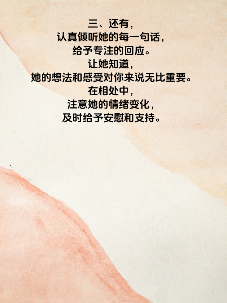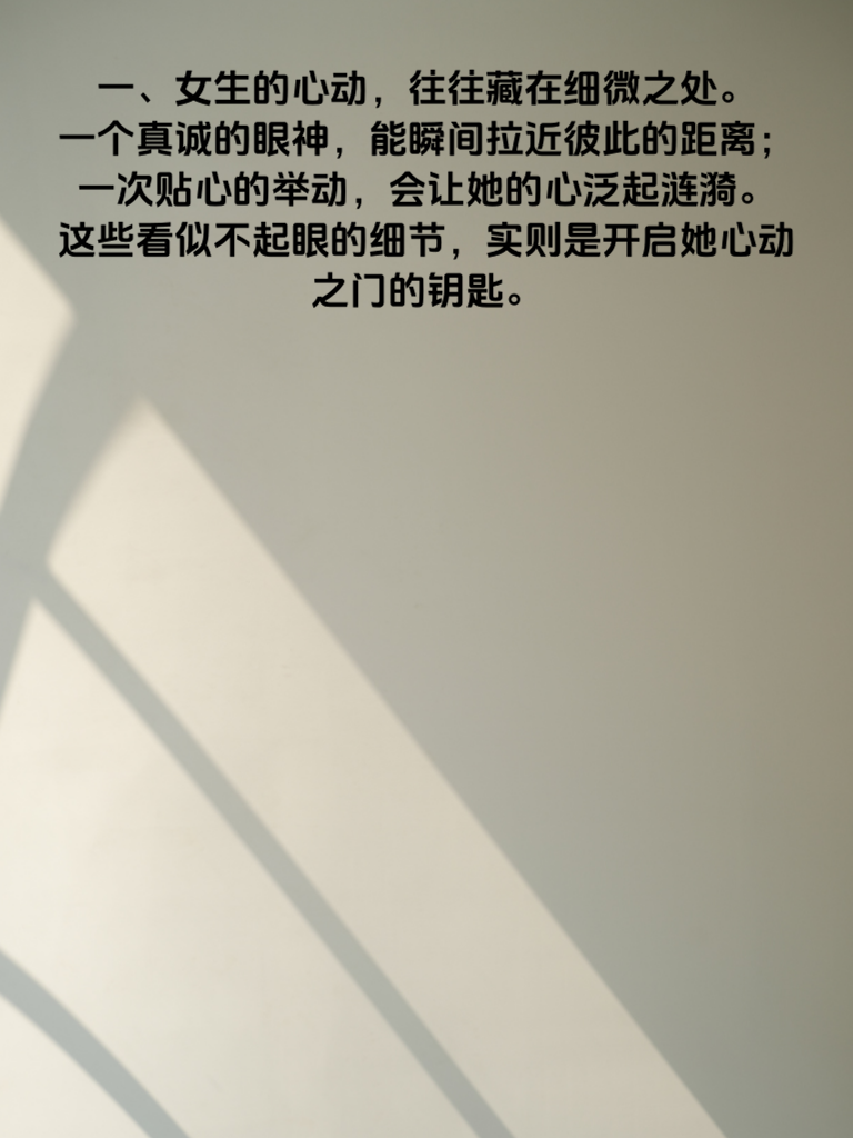 一、女生的心动,往往藏在细微之处。一个真诚的眼神,能瞬间拉近彼此的距离;一次贴心的举动,会让她的心泛起涟漪。这些看似不起眼的细节,实则是开启她心动之门的钥匙。 二、比如,记住她不经意间提到的喜好。当你在某个特别的时刻,送上一份契合她喜好的小礼物,她会感受到你对她的在意。又或者,在她忙碌时默默陪伴,适时递上一杯温水,这份温暖会悄然住进她心里。 三、还有,认真倾听她的每一句话,给予专注的回应。让她知道,她的想法和感受对你来说无比重要。在相处中,注意她的情绪变化,及时给予安慰和支持。 四、细节之处见真心,当你用心捕捉这些女生心动信号,用爱去浇灌每一个细节,就能走进她的内心世界,收获一份美好的爱情。让那些温暖而细腻的瞬间,成为你们感情升温的催化剂。