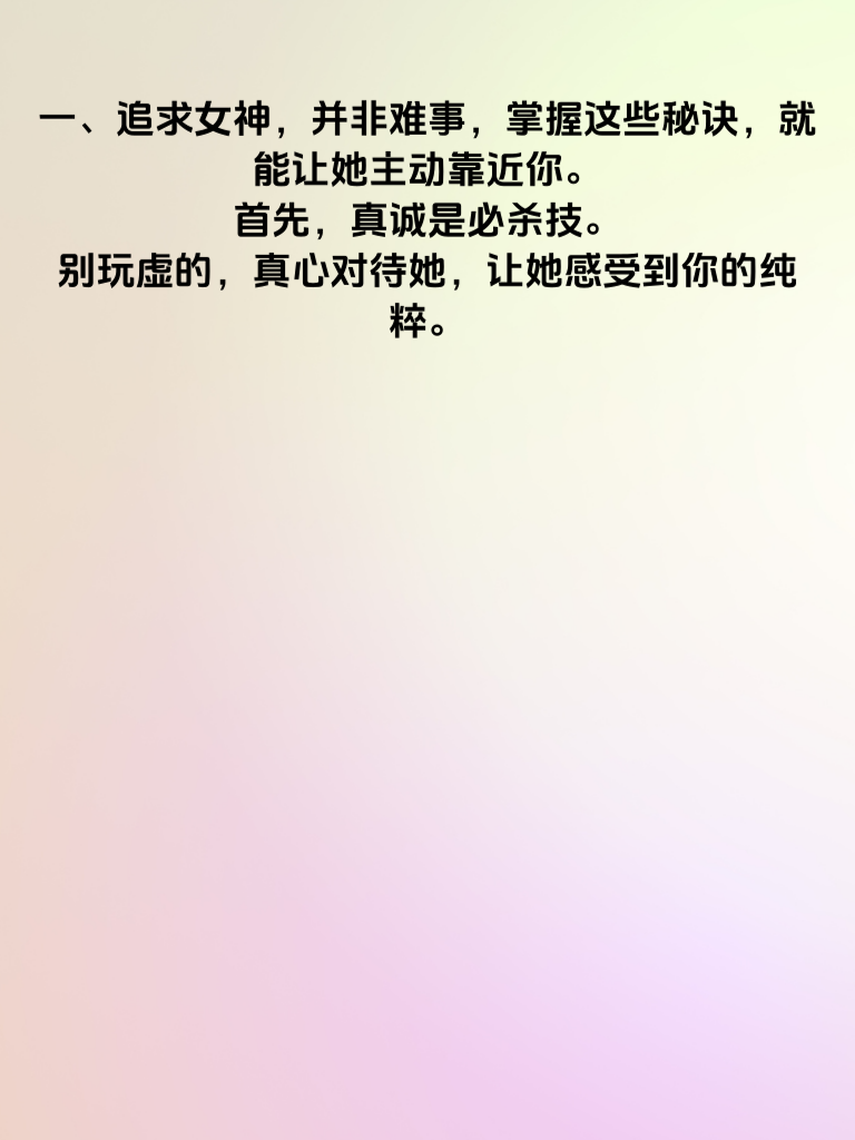 一、追求女神,并非难事,掌握这些秘诀,就能让她主动靠近你。首先,真诚是必杀技。别玩虚的,真心对待她,让她感受到你的纯粹。 二、了解她的喜好至关重要。清楚她爱什么、讨厌什么,投其所好,避开雷区,这样交流起来才更顺畅,也更容易走进她的心。 三、提升自身魅力不可忽视。无论是外在形象的打理,还是内在气质的修炼,都能让你在她眼中更具吸引力。 四、适时展现你的能力与才华。比如在工作上的专注、某项特长的精通,会让她对你刮目相看,心生钦佩。 五、制造一些浪漫又难忘的瞬间。不需要多昂贵,一份亲手做的小礼物,一次精心准备的约会,都能让她心动。 六、保持适当的神秘感。不要一下子把自己全盘托出,偶尔让她对你有新的发现,增添相处的乐趣。做到这些,女神主动向你走来就不再是梦。