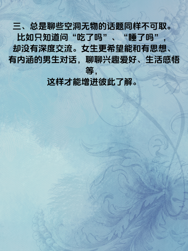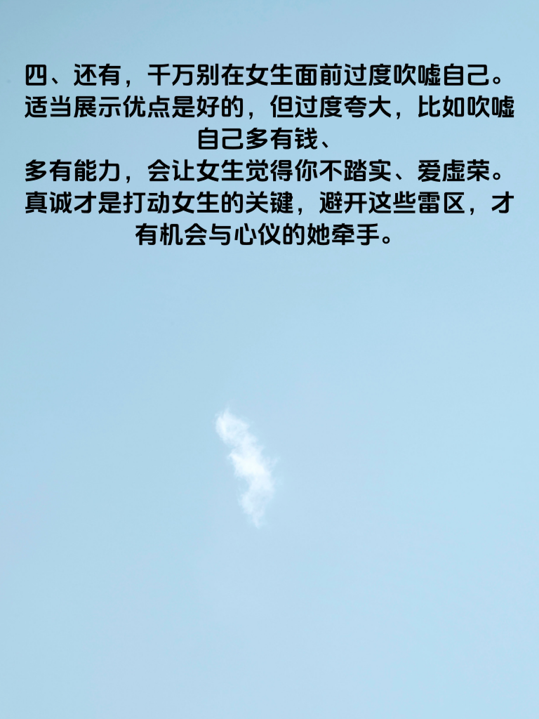 一、追求女生时,过度急切往往是个大雷区。有些男生刚认识女生不久,就迫不及待地表白或者频繁追问两人关系,这会给女生带来巨大压力。女生大多喜欢在相处中慢慢感受彼此的契合度,过于急切会吓跑她们。 二、不尊重女生的个人空间也是常犯的错。每个人都需要属于自己的时间和空间去做喜欢的事,若你总是黏着她,时刻想知道她的行踪,她会觉得失去自由,对你产生反感。 三、总是聊些空洞无物的话题同样不可取。比如只知道问吃了吗、睡了吗,却没有深度交流。女生更希望能和有思想、有内涵的男生对话,聊聊兴趣爱好、生活感悟等,这样才能增进彼此了解。 四、还有,千万别在女生面前过度吹嘘自己。适当展示优点是好的,但过度夸大,比如吹嘘自己多有钱、多有能力,会让女生觉得你不踏实、爱虚荣。真诚才是打动女生的关键,避开这些雷区,才有机会与心仪的她牵手。