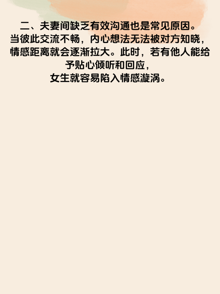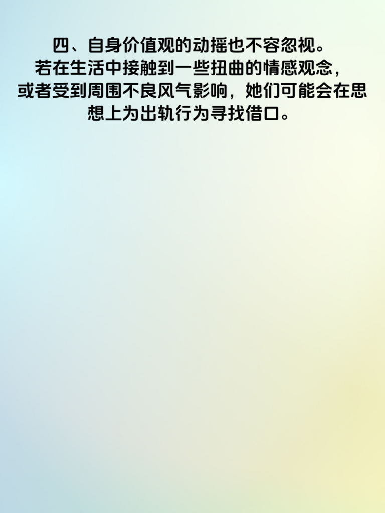 一、女生出轨,背后可能有这些原因。在感情中,女生出轨往往并非毫无缘由。首先,情感需求未被满足是一个关键因素。若长期在伴侣关系里感受不到理解、关爱与尊重,她们可能会向外寻求情感慰藉。 二、夫妻间缺乏有效沟通也是常见原因。当彼此交流不畅,内心想法无法被对方知晓,情感距离就会逐渐拉大。此时,若有他人能给予贴心倾听和回应,女生就容易陷入情感漩涡。 三、生活平淡乏味,日复一日的单调容易让女生心生厌倦。而外界的新鲜感与刺激对她们产生了强烈吸引力,从而促使她们做出错误选择。 四、自身价值观的动摇也不容忽视。若在生活中接触到一些扭曲的情感观念,或者受到周围不良风气影响,她们可能会在思想上为出轨行为寻找借口。 五、还有可能是对伴侣的失望累积。比如伴侣长期忽视家庭责任、沉迷不良嗜好等,让女生对这段关系彻底寒心,进而转向他人寻求温暖。