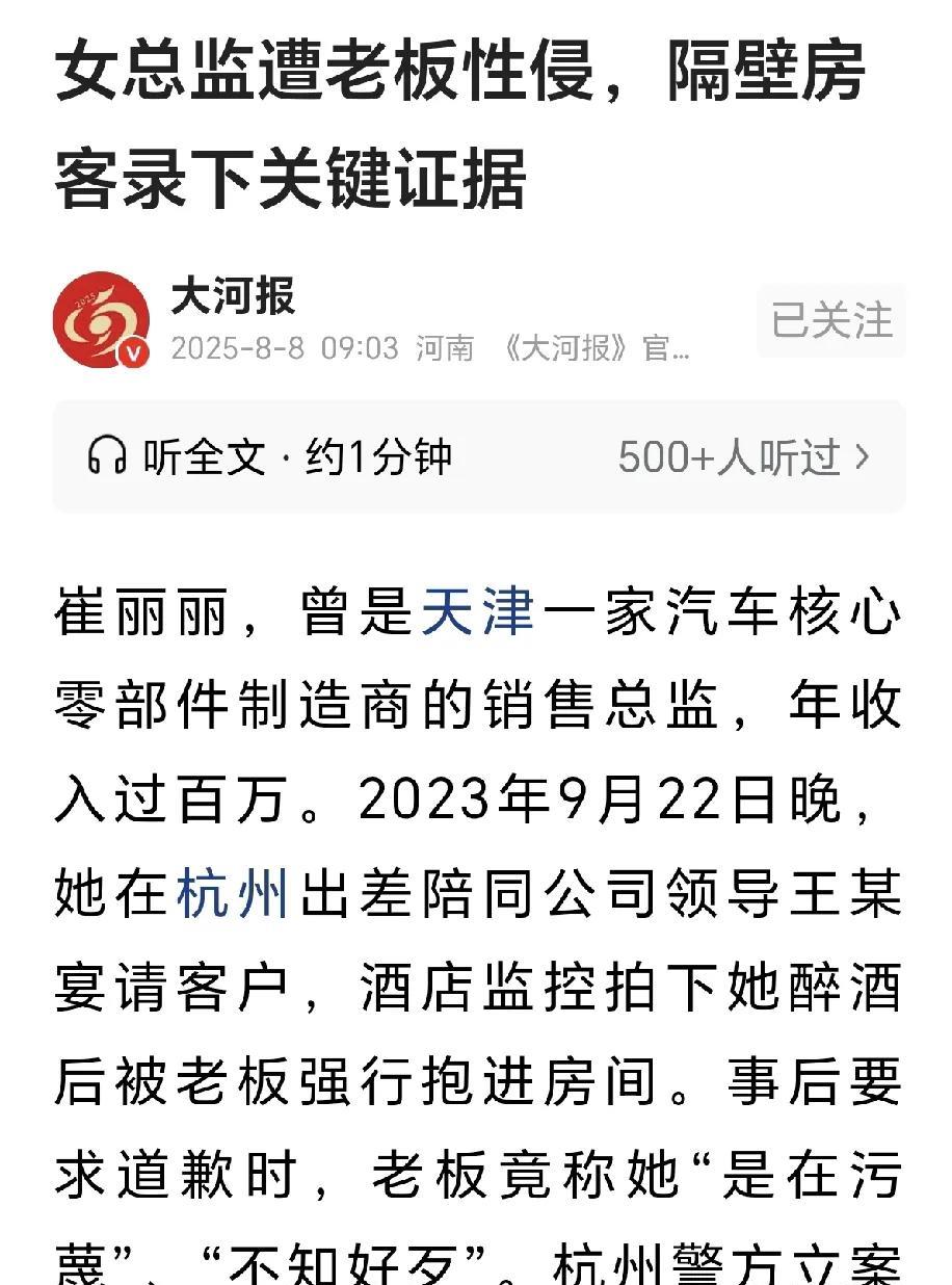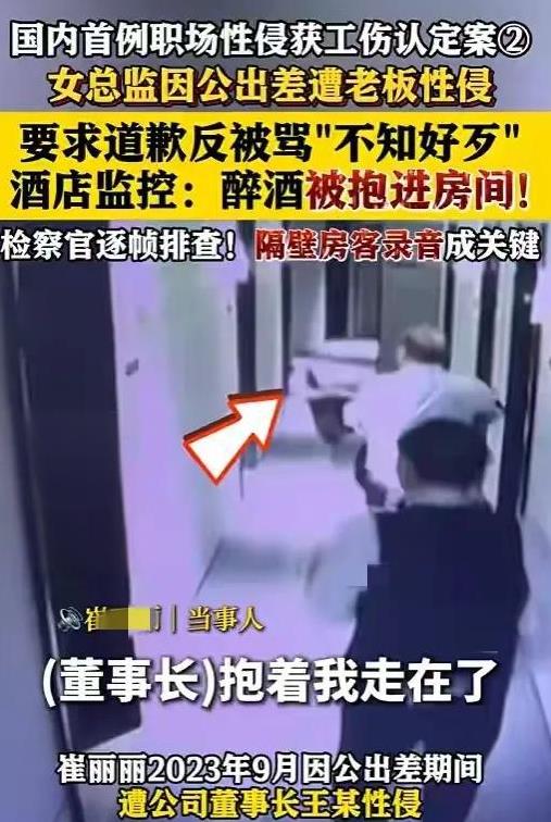 浙江杭州,一女子陪老板出差,安排好了酒店,请客户吃饭,饭桌上推杯换盏,女子喝醉,老板趁机将她抱到自己房间,女子大喊大叫: 我不要……,老板强行和她发 生 关 系,谁知动静太大,被隔壁客人听见,客人拿手机录下声音,随后,女子酒醒,要老板道歉,老板大怒: 不知好歹!你想污蔑!女子报警,要求做工伤认定,老板做梦也没想到,报 应来的如此痛快! 2025年8月8日,据大河报报道,一女子喝醉后被老板抱入房间,女子酒醒报警,老板悲剧了。 崔女士是个女强人,一心只搞事业,她在一家汽车零件制造商担任销售,因为业绩突出,很快就升任了销售总监。 2023年9月,因为业务需求,崔女士要和老板要到外地面见客户,老板请客户吃饭,一行人来到酒店。 饭桌上要了各种菜肴,还有高档的白酒,崔女士为了事业的发展,和老板客户推杯换盏。 可是她毕竟是个女子,酒量不能和他们相提并论,不大一会,她就酒劲上头。 她醉眼朦 胧,坚持喝到了最后,客人送走,她已经伏在桌上,不能起来。 上司早就对她有了想法,看她喝多,心里打起了主意。 上司叫她名字,看她不予回答,知道她不胜酒力,肯定已经酒醉如泥。 上司把她拦腰一抱,直接抱进了他自己房间,把崔女士往床上一扔,哐当一声关住了大门。 崔女士迷迷糊糊,似乎还有一些知觉,只是酒喝多了,天旋地转。 她心里明白,上司要干什么,她大声喊道: 我不要…… 隔壁住着一位客人,听见隔壁传来女子的声音。 客人吃惊,不知道隔壁发生了什么,他出于谨慎,拿起手机把声音录了下来。 崔女士遭到了侵 犯,心里十分难过,无论她在商场上如何叱咤,本质上来说,依旧是一个弱女子,她没有力量推开自己的上司。 崔女士的上司,早就对她垂 涎,遇到这么个机会,自然不肯放过。 他不顾崔女士的反抗,我行我素,结束之后,他沉沉睡去,崔女士酒醒,放声大哭。 她要求上司给她道歉,上司却毫不在乎,你不要觉得自己是个销售总监,你就要我道歉,你要搞清位置,我才是你的老板, 崔女士怒不可遏,你是老板咋了,老板也不能随意欺ru自己的下属,我靠本事吃饭,你必须给我道歉! 谁知上司反咬一口,说她污 蔑,不知好歹! 崔女士丝毫不怕,你是老板,也不能让你胡来! 崔女士报警,警方赶来,调取了酒店的监控。 监控里显示,崔女士醉酒,被上司王某抱到他房间里。 案件交到了检察机关,检察官调出监控,一帧一帧的在画面上查看。 检 察 官不但看到,王某把崔女士抱到他房间,还看到隔壁的客人在1点30分多一点,拿着手机,从隔壁客房里面走了出来。 检 察 官认为,客人肯定是录下了什么,随即找到这位客人,果不其然,客人用手机录下来崔女士反抗的声音。 再加上酒店里的监控录像,清晰的显示,王某将崔女士抱到他的房间里。 这样一来,就形成了一个完整的证据链,证实了王某的行为,崔女士所说属实,王某的确犯下了罪行! 王某自以为天衣无缝,崔女士并不能把他怎么样,谁知铁证如山,他无法抵赖。 2024年4月2日,法院判决,王某犯强间罪,判处有期徒刑4年。 崔女士是在为公司业务出差期间,受到了伤害,她一页一页,将材料全部整理清楚,清析,一目了然。 崔女士申请工伤,并整理劳动仲裁材料证据。 经过两年的努力,崔女士最终如愿以偿,被认定为工伤,原公司支付崔女士111万元。 那么,这件事在法律上是怎么认定的呢? 《刑法》第236条规定:以bao力、胁迫或者其他手段强间妇女的,处三年以上十年以下有期徒刑。 王某在崔女士醉酒无力反抗的情况下,将其抱入房间并实施侵 犯,构成强间罪。 《工伤保险条例》第14条规定:职工有下列情形之一的,应当认定为工伤:(五)因工外出期间,由于工作原因受到伤害或者发生事故下落不明的。 崔女士是因业务需求,陪上司出差,属于因工外出期间。 崔女士受到伤害,与她外出工作,陪客户吃饭应酬直接相关,符合“由于工作原因受到伤害”的情形。 因此,崔女士被认定为工伤,原公司支付111万余元赔偿,符合该条款规定。 《刑事诉讼法》第50条规定:可以用于证明案件事实的材料,都是证据。证据包括:(一)物证;(二)书证;(三)证人证言;(四)被害人陈述;(五)犯罪嫌疑人、被告人供述和辩解;(六)鉴定意见;(七)勘验、检查、辨认、侦查实验等笔录;(八)视听资料、电子数据。 隔壁客人录制的音频以及酒店监控录像,属于“视听资料”,是法定证据类型。 检察机关通过调取监控及录音,结合被害人陈述,形成完整证据链,证明王某的犯罪事实。 2024年4月2日,王某伏法,被法院判决犯强间罪,判处有期徒刑4年。 两年之后,崔女士认定工伤,原公司支付她111万元。 对此,你怎么看? 关注@王哥说法 学法律知识。#头号创作者激励计划#