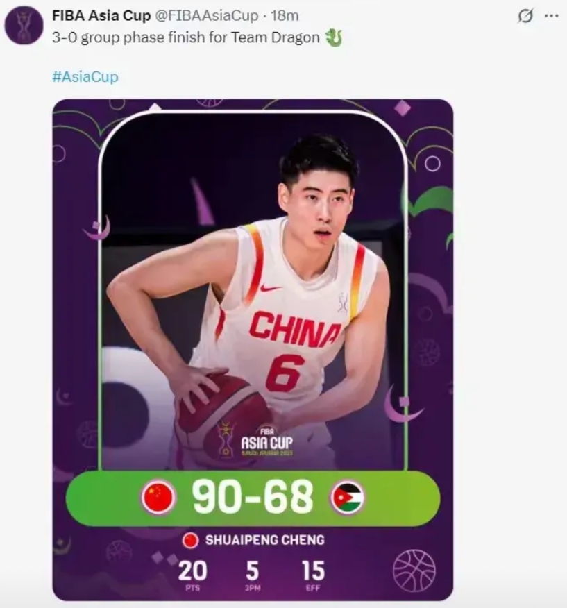 本届亚洲杯、中国男篮目前已出战三场,程帅澎场均能得到15.3分、1.0篮板和2.0助攻,其三分远投命中率高达恐怖的44.4%。而就在刚刚结束的中国男篮与约旦队的比赛中,程帅澎又得到了全队最高的20分,俨然已经成为当下的中国男篮最重要的主角之一,并成为本场比赛的MVP!毫不夸张的讲,如今程帅鹏的作用已堪比球队大腿赵睿与胡金秋…毕竟程帅澎在攻防两端做的太好了,甚至已经有些喧宾夺主的意思了。