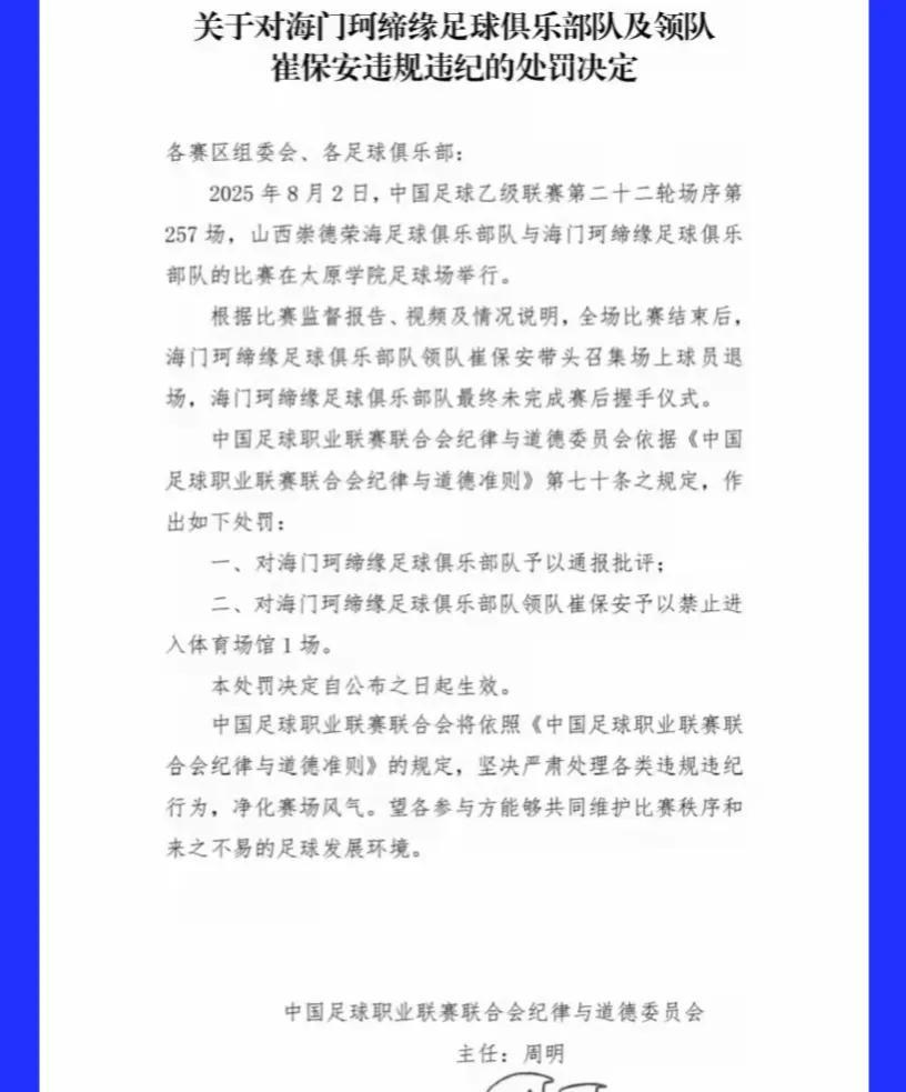 8月7日、8日,江苏南通(中乙)领队、江苏女足(女超)主帅接连被中国足协处罚,江苏省足协该好好反思、反省了,务必要抓好下辖球队思想建设。 作为一个体育大省,低调规矩、谨言慎行是必须的,因为有太多的眼睛盯着,如今正是苏超引领中国民间足球风潮之际,江苏足球从上到下更应该严格要求自己,时刻与中国足协保持一致。 8月7号,中足联对中乙南通海门珂缔缘俱乐部及其领队崔保安开出了罚单,理由是:联赛第22轮山西崇德荣海vs海门珂缔缘,比赛结束后,领队崔保安带头召集场上球员退场,最终未能完成赛后握手仪式。 8月8号,中国足协对江苏女足主教练陈婉婷开出罚单,理由是“发表不负责任评论,造成不良影响”,但究竟陈婉婷说了什么,处罚决定书上只字未提,有什么不良影响,也没有给予指出。 正如处罚决定书最后所写,“共同维护来之不易的足球发展环境”,这是重点,也是千千万万足球人所共同希望的。 中国足球要发展,离不开一个风清气正、公开透明的大背景,绝不能因为个别足球人的言与行而坏了这样一个良好的大环境。