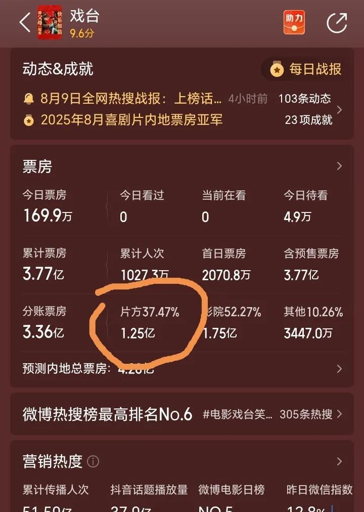 《戏台》接近尾声,陈佩斯到底能分多少钱?看这里! 陈佩斯导演的电影《戏台》今天已经上映17天了,基本上已经接近尾声,截止今天,票房3.77亿,现在每天小几百万,后面只会越来越低,最终估计在4个亿左右。 那么陈佩斯能够分多少钱? 按照发行合约,片方分账比例是37.47%,如果以今天票房结算,片方可以分得约1.25亿!如果最后4亿票房结束,片方分得约1.5亿! 1.5亿分账,扣除制作成本1个亿。纯利润5000万。这5000万利润将由所有投资方分成。 从公开的资料来看,欢喜传媒是第一大股东,第二大投资方是弘道影业,第三就是黄渤的公司瀚纳影视,他是片酬入股,第四才是陈佩斯的大道文化! 一般来说,影视剧排名,都是以投资额高低决定排名先后。据说黄渤是2000万片酬入股,排第三。所以我分析,陈佩斯大概投资在1000万左右,占股约10%。所以他最终盈利约500万元左右! 但是陈佩斯不止有投资分利,他是导演主演,所以他还有片酬。网传他所有工作酬劳是500万打包。 所以最终合计,陈佩斯在《戏台》这部戏里,个人一共赚得约1000万左右。#电影戏台#