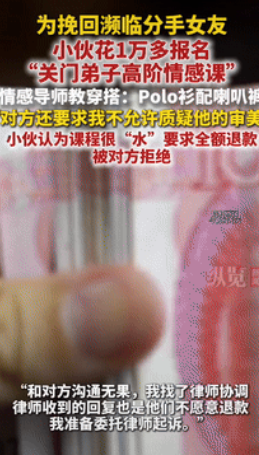 绷不住笑了!陕西一小伙为挽回女友,不惜花1万多参加“情感挽回课”,可导师教授的内容,却让男子大吃一惊,竟是怎么搭配衣服,外加让他和女友吹牛,小伙觉得不靠谱,就想要退款,不料,对方的态度,却让小伙很气愤,   据纵览新闻8月8日的报道,小伙和女友已经谈了大半年了,他对女方还是挺满意的,只不过如今女方想要分手,他对此很是苦恼。   所以为了能让这段爱情继续下去,小伙可谓是想尽一切办法,但都没什么用,于是他就参加了个培训课,让所谓的“情感大师”帮自己出招。   然而,当看清培训内容后,他却傻了眼,其内容就只是讲解该如何穿搭,还给小伙了一套方案,就是Polo衫加喇叭裤的搭配。   小伙就觉得这种穿搭,非常的差劲和难看,可导师却觉的这套很帅,并且让小伙不要质疑他的审美。   除去改变穿搭之外,导师还让小伙学会吹嘘,将自己打造成有上进心且有钱的模样,以此来哄骗女友。   见状,他就意识到这所谓的培训课,完全就是个“水货”,没有半点真材实料,所以就想要退费。   然而,对方却表示这钱退不了,找律师过去协商,也是同样的结果,如今就准备走法律途径来解决。   有网友就说了,要是把这1万多,直接转给女友,那俩人早就和好了,还得去参加什么培训课,一点主次都不明白,这下人财都要两空了。