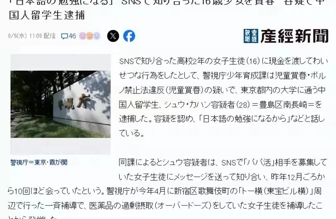 中国28岁留学生嫖娼日本16岁高二学生,被抓后理由竟然是为了多学日语。网友表示: