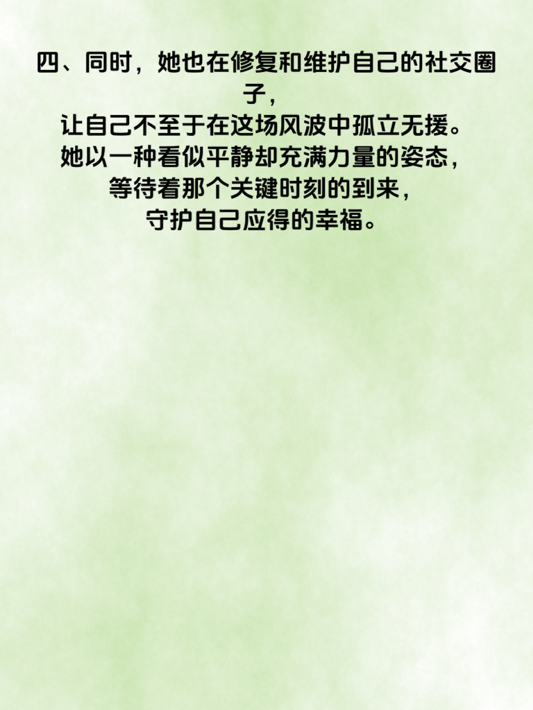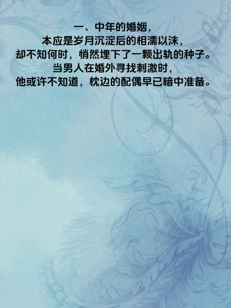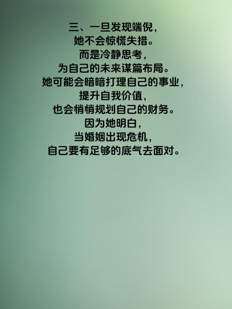 一、中年的婚姻,本应是岁月沉淀后的相濡以沫,却不知何时,悄然埋下了一颗出轨的种子。当男人在婚外寻找刺激时,他或许不知道,枕边的配偶早已暗中准备。 二、聪明的女人,在婚姻的细枝末节中敏锐察觉。她不动声色,却已洞察一切。她开始留意男人的行踪,关注他的情绪变化,收集着那些看似不起眼却可能是线索的蛛丝马迹。 三、一旦发现端倪,她不会惊慌失措。而是冷静思考,为自己的未来谋篇布局。她可能会暗暗打理自己的事业,提升自我价值,也会悄悄规划自己的财务。因为她明白,当婚姻出现危机,自己要有足够的底气去面对。 四、同时,她也在修复和维护自己的社交圈子,让自己不至于在这场风波中孤立无援。她以一种看似平静却充满力量的姿态,等待着那个关键时刻的到来,守护自己应得的幸福。
