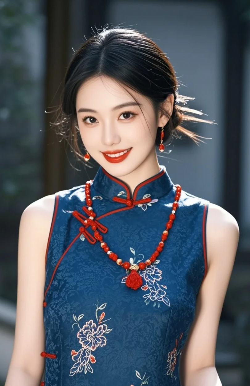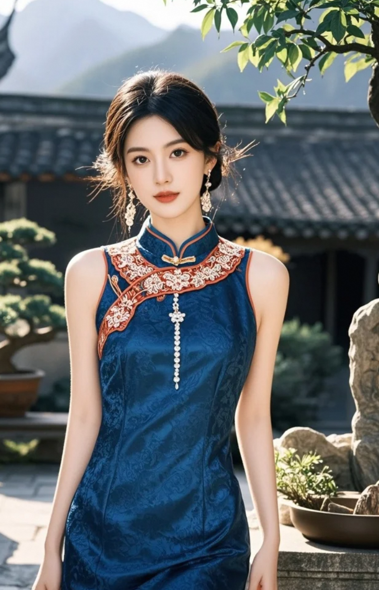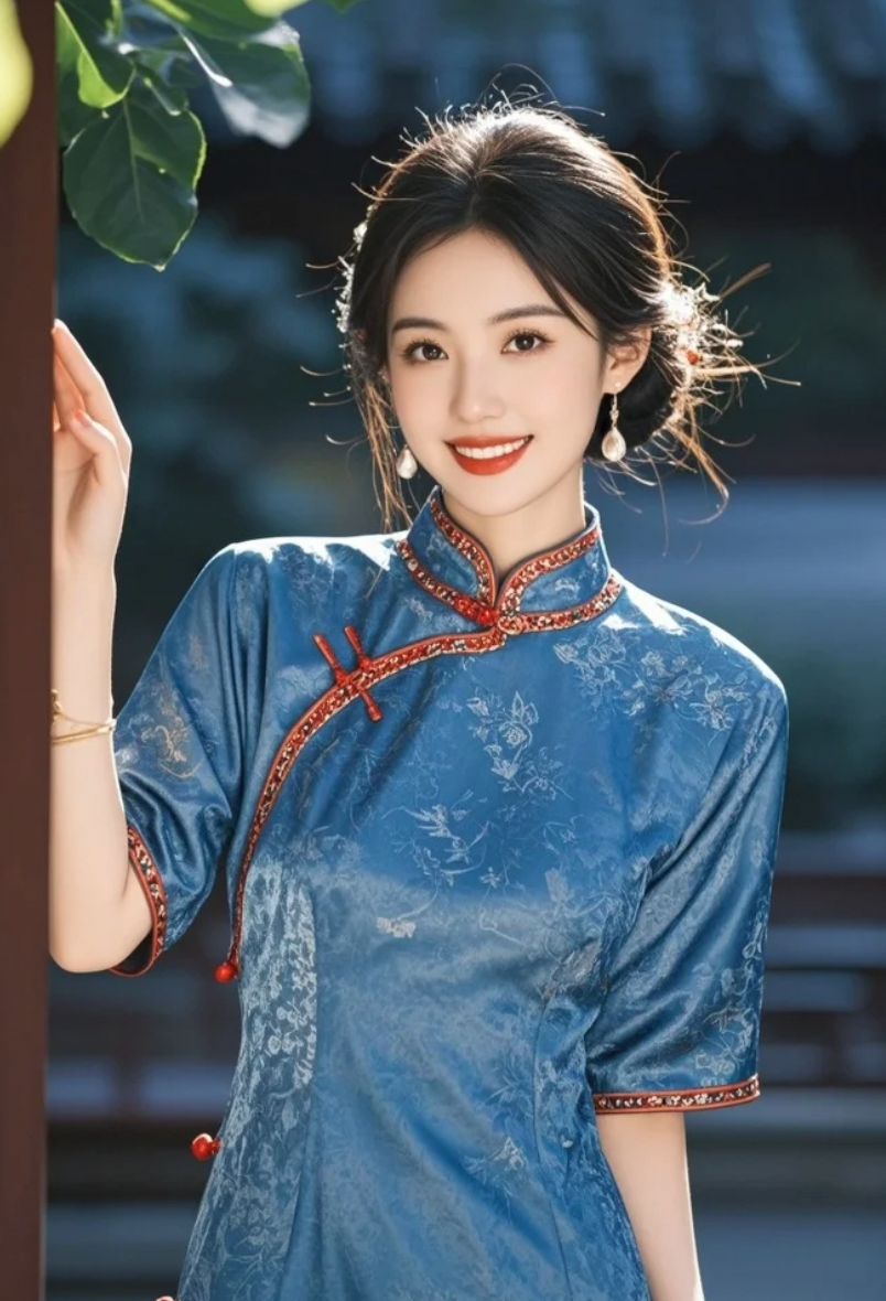 当知性美人遇上丝缎蓝旗袍,连庭院的风都开始为她打光