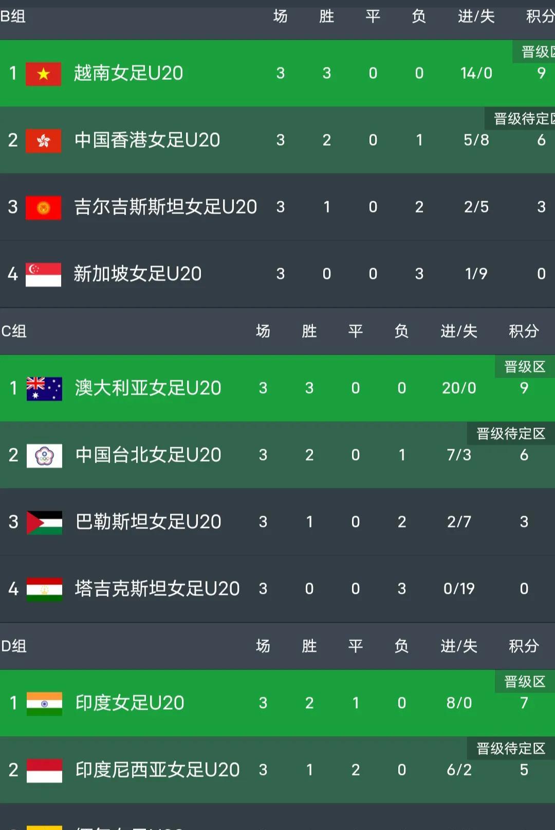 U20女足亚洲杯预选赛落幕,中国女足分别以6∶0、7∶0、8∶0的卓越战绩完成三场小组赛。 在八个小组的较量中,朝鲜、越南、澳大利亚、印度、中国、日本、乌兹别克斯坦、韩国8支队伍以小组头名晋级U20女足亚洲杯正赛。 G组的约旦积7分、11个净胜球,H组的孟加拉国积6分、5个净胜球,C组的中国台北积6分、4个净胜球,她们三支队伍成为成绩最好的3个小组第二名而晋级U20女足亚洲杯正赛。 以上11支队伍与东道主泰国队构成12支正赛球队,参加于2026年4月份举行的U20女足亚洲杯。 本届U20女足亚洲杯,中国女足将要对标的当然不是朝鲜女足、日本女足,她们是2024年的世界杯冠、亚军,刚刚结束的小组赛朝鲜攻入36球、日本攻入32球,她们如此强大的实力早已经不是我们能够挑战的。 与澳大利亚女足、韩国女足争夺亚洲季军的话语权,这才是准确的定位,问题是,中国女足已经越来越难以赢下她们了,尤其是澳大利亚女足,近几年来,中国女足各个级别队伍成为其手下败将慢慢成为了常态。 亚洲区女足运动的发展现状告诉我们,中国女足目前比较合理的目标是: 不要被起步晚、投资小、没有职业化的韩国女足过快的超越,不要过早的掉入亚洲第五名。 当然,我们的身后还有越南女足、泰国女足、乌兹别克斯坦女足等一大批追兵,细思恐极。