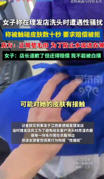 “不能让你白摸吧!”江西景德镇,女子去理发店洗头,17岁的男孩在给她洗头之前,拿了一块毛巾塞进了她的衣领,结果女子却表示,感觉自己被骚扰了!要求店内道歉并且赔偿!网友:洗头不都是这样吗?就她金贵?