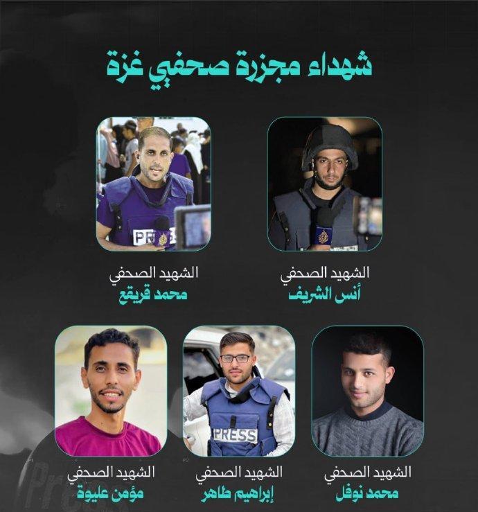 当地时间昨天晚上,以色列空军蓄意轰炸了巴勒斯坦加沙市希法医院大门口的记者帐篷,杀害了5名半岛电视台的记者和摄影师,其中包括这个世纪全球范围内最著名的战地记者之一阿纳斯·沙里夫。 死者名单: 记者阿纳斯·谢里夫 记者穆罕默德·卡尔克 记者穆罕默德·索巴赫 摄影师易卜拉欣·扎赫尔 摄影师穆罕默德·努法尔 以色列军方随后立即发表声明宣布对这次恐怖袭击负责,声称杀死知名记者是一项重大战果。 #巴以冲突##以色列暴行##战地记者#