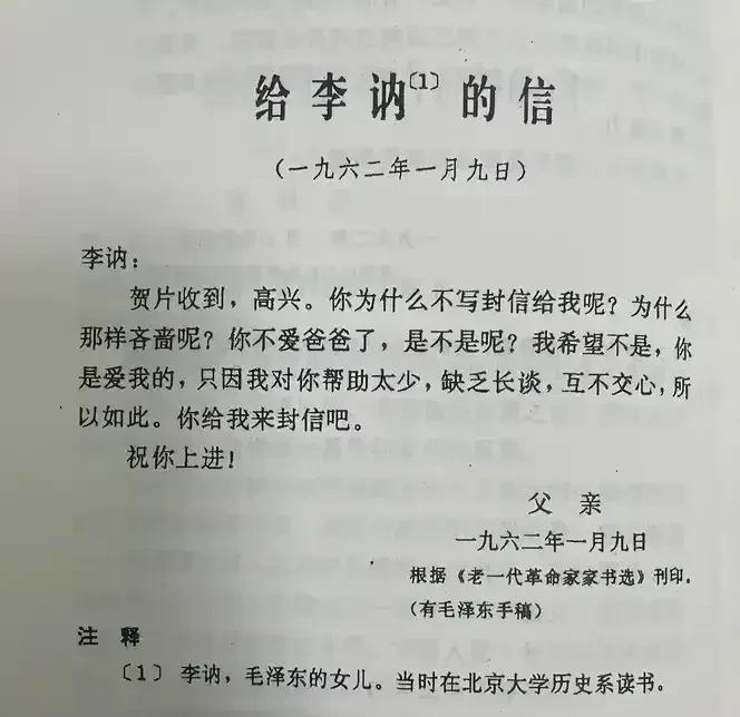 看了主席写给小女儿李讷的信(图二),眼泪在眼眶里打转,伟人也有儿女情长的一面,他也特别想念自己的小棉袄。 1959年,李讷以优异的成绩考上了北京大学历史系,主席要求她住校,和普通人一样过着学生的生活,同学们也不知道她是主席的女儿。 1962年底,读大学的李讷给主席寄了一个贺年片,老人家高兴的不得了,并因为女儿没有写信感到非常的惋惜,字里行间和我们这些普通的爸爸毫无差别。 李讷是最幸福的,一直生活在父母身边,有这样一个伟大的父亲,却没有给她留下任何特权和财富。 向主席致敬! 祝李讷健康长寿!