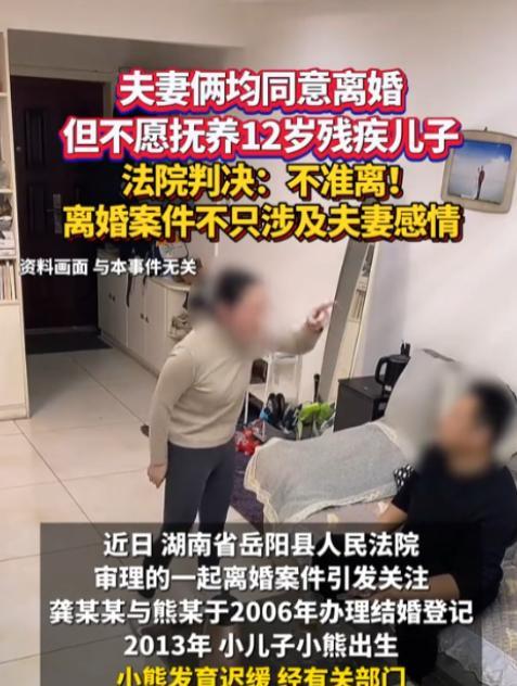 “真让人尴尬!”湖南岳阳,一对夫妻长期分居后决定离婚,结果两人都不愿意抚养他们12岁、身有残疾的小儿子,甚至把孩子当成“负担”,法院在考虑到离婚对孩子的影响后,最终做出了判决。 麻烦看官老爷们右上角点击一下“关注”,既方便您进行讨论和分享,又能给您带来不一样的参与感,感谢您的支持! 据闪电新闻8月5日报道,2013年,小熊(化名)的出生本该给这个家带来双倍的欢乐,可随着孩子慢慢长大,父母发现他和其他孩子不太一样:说话晚,走路不稳,去医院一查,是发育迟缓,后来,小熊被诊断为一级言语残疾,这个消息像块大石头,重重地砸在了这个家庭身上。 日子在磕磕绊绊中还能过,可2023年的一个决定,彻底改变了这个家,龚某某(化名)说要去东莞打工挣钱,就这样,夫妻俩开始了聚少离多的生活,分居期间,两人联系越来越少,感情也渐渐淡了。 没过多久,龚某某就第一次起诉离婚,那时候法院认为他们还有和好的可能,就没准离,可这个判决并没能挽回这段婚姻,夫妻俩的关系反而更僵了。 2025年,龚某某再次提出离婚,这回熊某也同意了,两人都觉得这段婚姻该结束了,可一说到小熊的抚养问题,两人立马翻了脸,龚某某说自己在外打工,没法照顾孩子;熊某说自己没工作,还要管大儿子,也养不了。 一个12岁的残疾孩子,就这样成了父母眼中的“负担”,被推来推去,这哪里是在商量孩子的未来,分明是在踢皮球。 法院的判决很坚决:驳回离婚请求,法官在判决书里写得明白,处理离婚案不光要看夫妻感情,更要考虑未成年人的权益,小熊是一级残疾,正是最需要照顾的时候,父母却都想撒手不管,这完全违背了法律规定的抚养义务。 判决一出,在网上引发热议,有人支持法院的决定,说这对夫妻太自私,把亲生儿子当成了累赘,就该让他们继续负起责任,但也有人担心,强行把感情破裂的夫妻绑在一起,受苦的还是孩子。 对此,你怎么看?欢迎留言评论! 信息来源:闪电新闻2025年8月5日