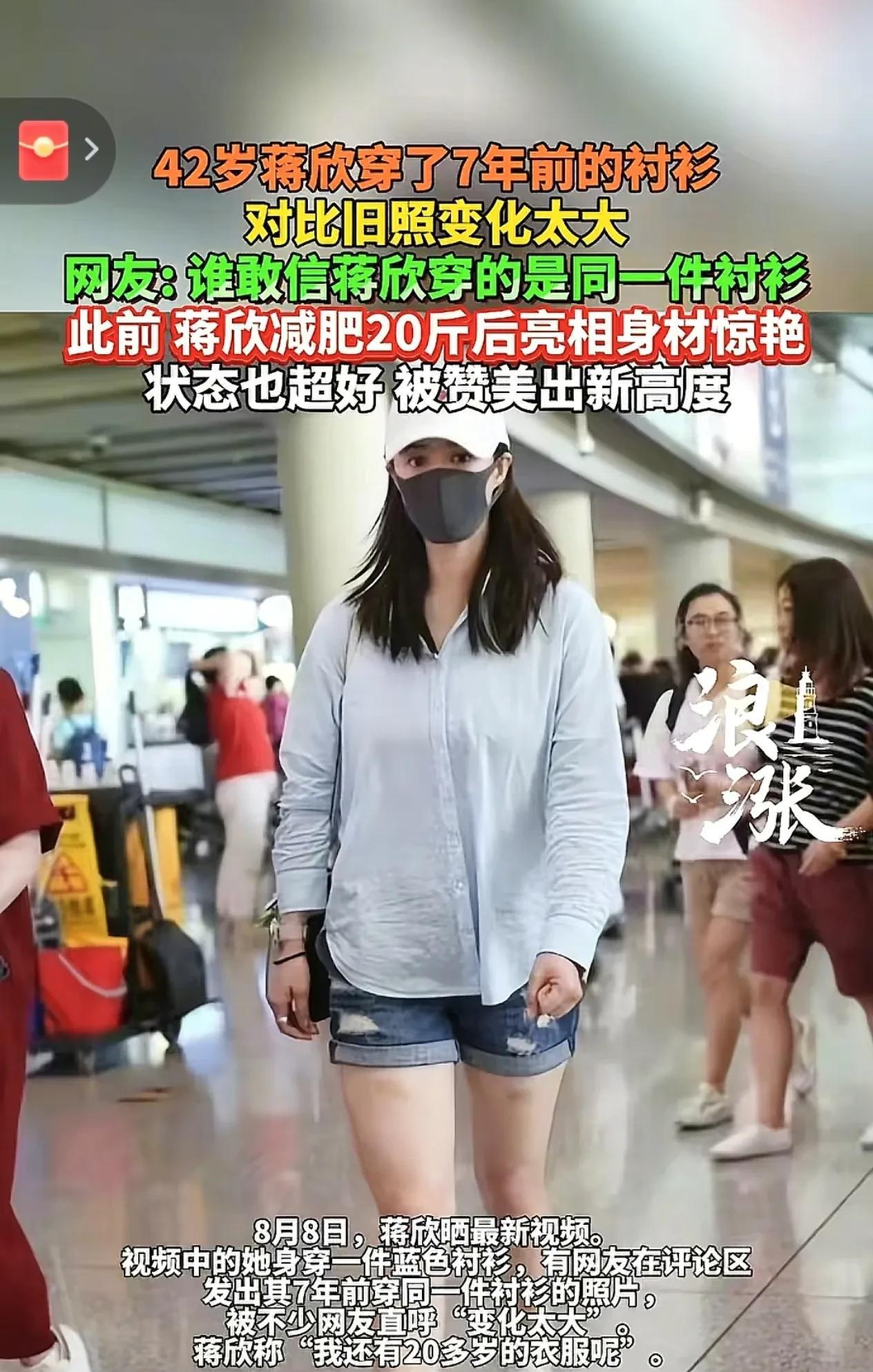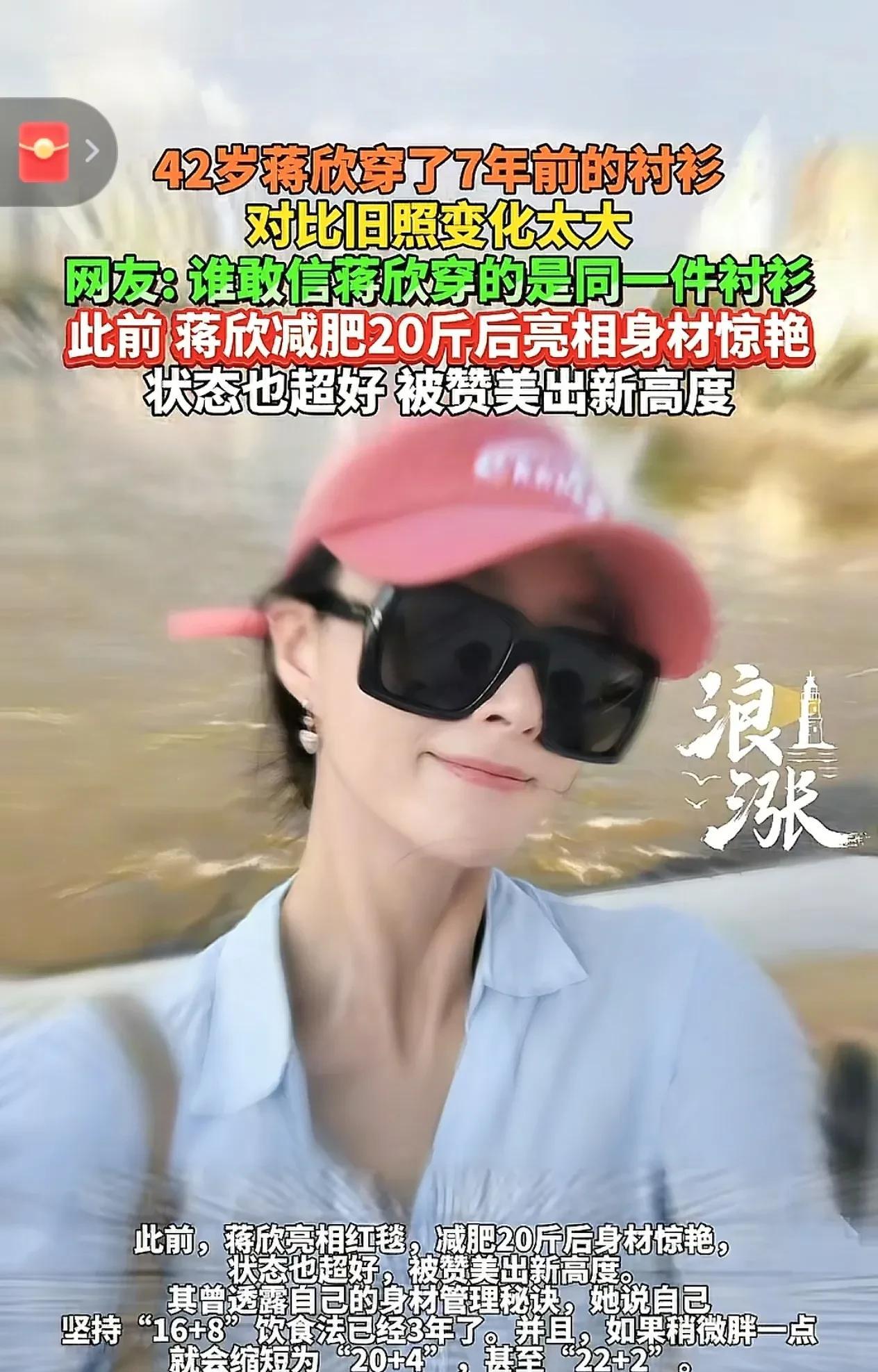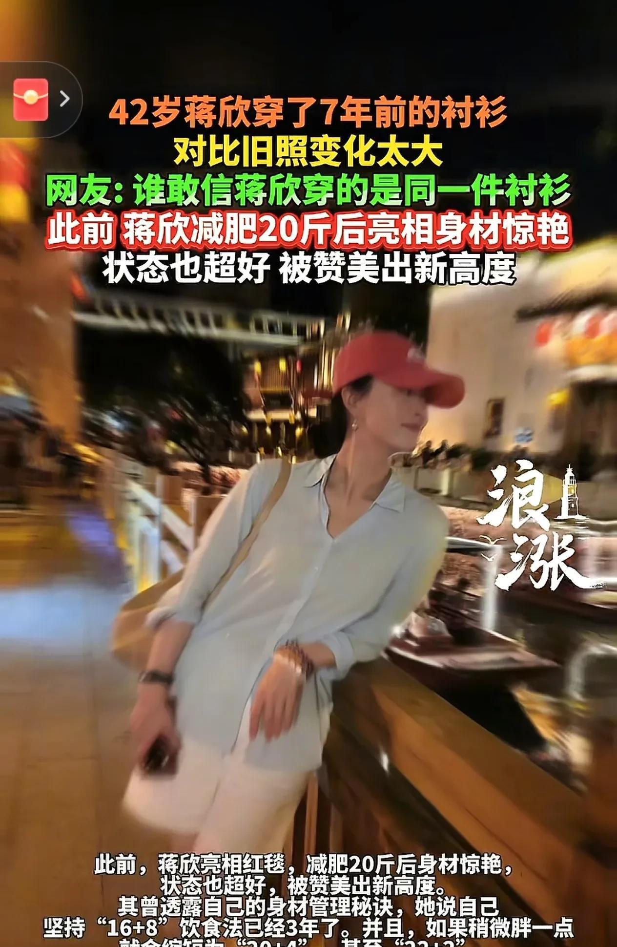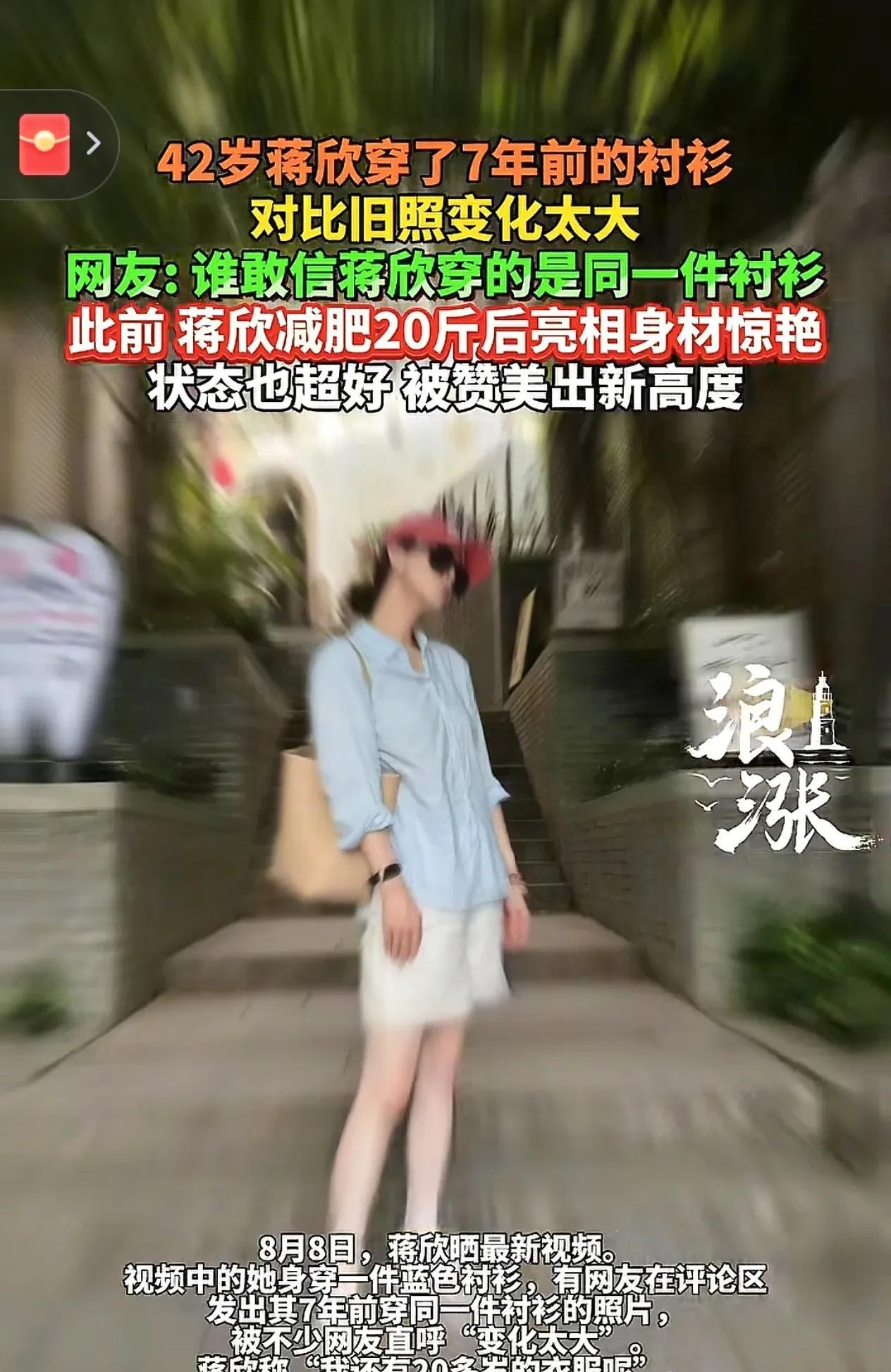 近日,蒋欣晒出的一段视频火了!视频里,42岁的她身着一件蓝色衬衫,清新又减龄。有眼尖的网友翻出7年前她穿同一件衬衫的旧照,对比之下,变化堪称天翻地覆。 7年前,这件衬衫穿在蒋欣身上略显紧绷,勾勒出她丰腴的身形 ,那时她被称为“微胖女神” ,身材备受争议。如今,同样的衬衫却变得松松垮垮,蒋欣四肢纤细,锁骨清晰,整个人瘦高又有气质。 此前,蒋欣成功减肥20斤,在红毯上惊艳亮相,她的状态和气质得到了大众的一致夸赞。这次同一件衬衫带来的巨大反差,更是让网友们惊叹:“谁敢信这是同一件衬衫!”不得不说,蒋欣的自律和坚持太令人佩服,这身材管理堪称励志模板 。#明星# #蒋欣# #蒋欣身材# #娱乐圈# #娱乐圈每日热议#