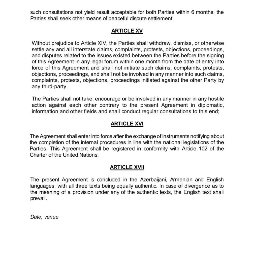 【俄维和部队失去存在的可能性:阿亚外交部公布两国和平协定文本】 8月11日,阿塞拜疆和亚美尼亚两国外交部网站上公布了《亚美尼亚共和国与阿塞拜疆共和国关于和平及建立国家间关系的协定》文本。协定包含17个条款,规定双方相互承认主权和领土完整,放弃领土要求,并禁止第三国部队沿共同边界部署。 协定第七条禁止双方在其共同边界沿线部署第三国部队,这实际上排除了俄罗斯维和人员在该地区存在的可能性。该协议还规定,双方将相互承认前苏联加盟共和国的边界作为独立国家的国际边界,并完全放弃相互之间的领土要求。 根据第15条,双方承诺在协议生效后一个月内,撤回与签署协议前双方问题相关的所有国际诉讼、申诉和异议。该文件还规定,在完成国内批准程序后的一定期限内,阿塞拜疆和亚美尼亚将建立外交关系。 协定特别关注武装冲突中失踪人员的问题。双方承诺负责寻找失踪人员的下落并交换信息,包括寻找遗体并将其归还。为确保协议的执行,将成立一个双边委员会。 该协定的发布是在两国领导人于8月9日在白宫签署和平宣言几天后。当时,亚美尼亚总理尼科尔·帕希尼扬和阿塞拜疆总统伊尔哈姆·阿利耶夫在唐纳德·特朗普的见证下,签署了和平框架协定。 美国政府正在推动“特朗普国际和平与繁荣之路”方案,即穿越亚美尼亚领土的赞格祖尔过境走廊建设,美国将获得其为期99年的独家开发权。该走廊旨在连接阿塞拜疆本土与通过亚美尼亚领土的纳希切万自治共和国,绕过俄罗斯和伊朗。