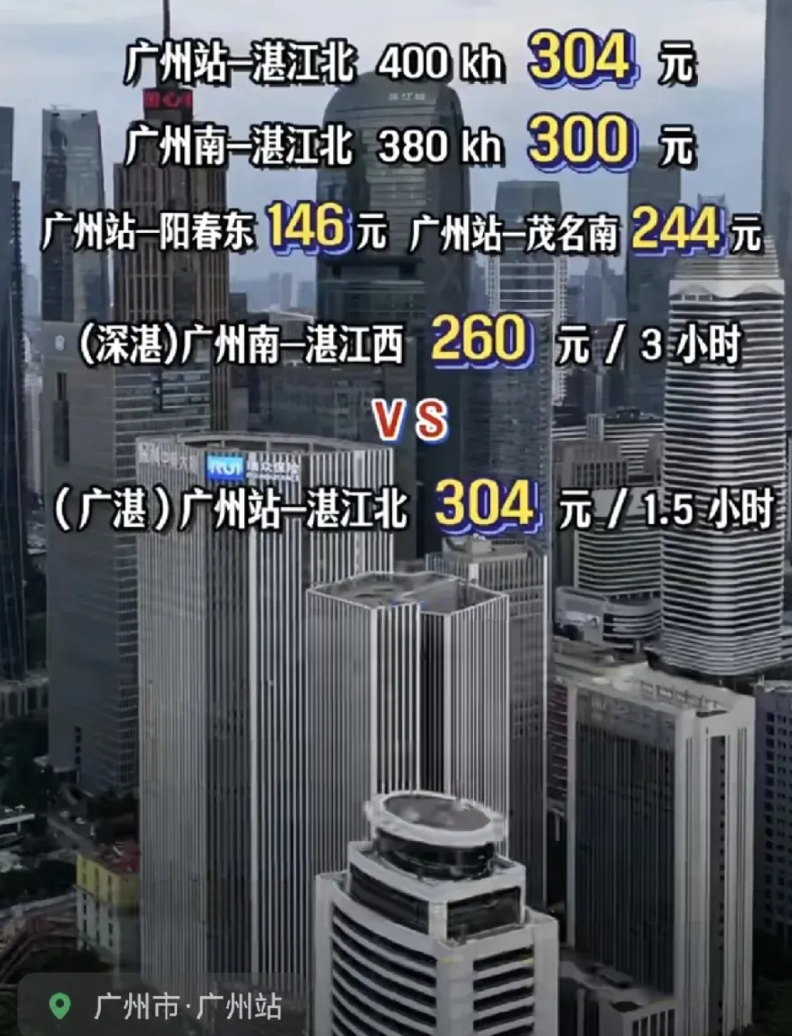 粤西老百姓期待的广湛高铁票价公布了,有网友评论“广州南到长沙南710公里,二等座高铁票价是315元,广湛高铁400公里收304元,怎么定价的?真当粤西人当作水鱼了”。 我想大多数湛江人是没钱,而不是没时间,平常时候花一百块六个小时的绿皮车也可以到广州,这么贵的高铁宁愿不坐。