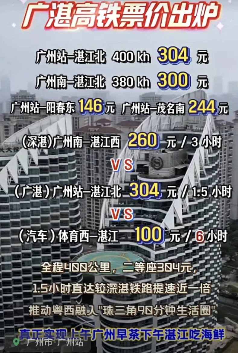 粤西老百姓期待的广湛高铁票价公布了,有网友评论“广州南到长沙南710公里,二等座