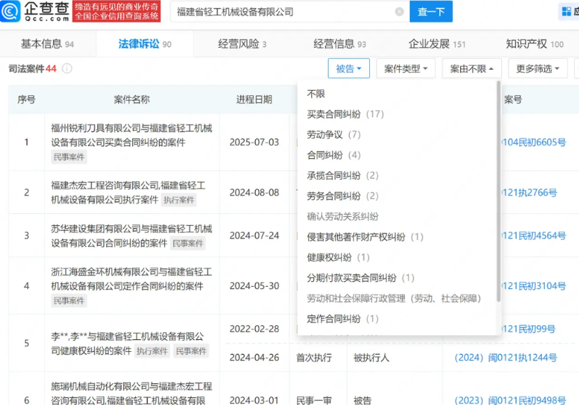 【福建57岁员工外派半月后跳桥身亡,去年垫款还没报销】 据报道,福建省轻工机械设备有限公司一57岁员工,被外派到湖北工作15天后跳桥身亡,曾多次表示自己不愿出这趟差,理由是去年去北海出差垫付的9300元报销款还未报销,在外出差很辛苦,又无补贴。家属质疑工作压力大,企业否认。 企查查APP显示,涉事公司成立于2001年4月,法定代表人为李祥凌,注册资本为4000万元,经营范围包含机械设备研发、五金产品制造等,由两名自然人共同持股。企查查信息显示,近年来,该公司涉及多起司法纠纷,案由包括劳动争议、合同纠纷、健康权纠纷等。