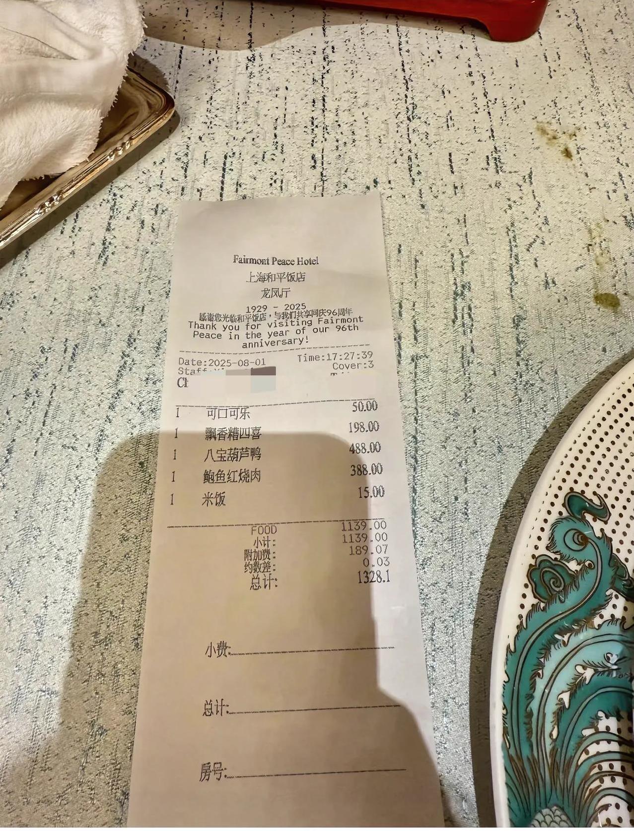 上海和平饭店,3菜一饭一可乐, 还有附加费,味道一般般,吃完逛外滩是真方便!