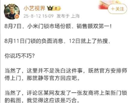 小米爆发门锁事件是竞争对手故意搞事?某网络大V透露,8月7日米系博主“小马甲不小”才爆料小米智能门锁销量销受金额双双第一,遥遥领先第二,最后表示小米智能门锁销售额是华为同类产品的五倍。但是才过了4天,8月11日小米智能门锁的负面消息就爆发了,之后8月12日就上了热搜。巧合的是有网友在评论区发了一张某友商的将上新门锁的截图,虽然最后“小艺视界”表示应该只是巧合,但是明眼人瞧得出来,博主的意思就是有人故意搞事,企图搞丑小米智能门锁名声,让自家产品抢占市场,究竟是哪位友商,“小艺视界”也没明说,有人知道是哪家吗?