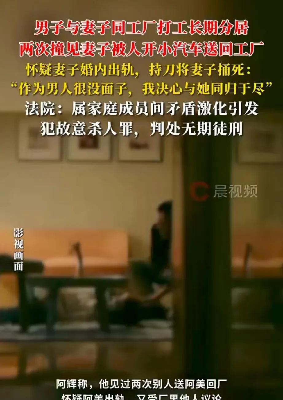 广东江门,男子和妻子在同一工厂打工,但因感情不和分开居住。期间,他多次看到妻子半夜坐其他男人的车回厂,再加上闲言碎语满天飞,男子认定妻子在外面有人了,作为男人,颜面尽失,便尾随妻子质问她,大不了就同归于尽。期间两人发生激烈争吵,男子冲动之下,用刀将妻子捅刺,妻子当场身亡,这下,男子悲剧了。 8月11日,据潇湘晨报报道,陈某和妻子刘某结婚多年,但感情一直不好,为了养家糊口,两人背井离乡,到外地打工。 虽说两人在同一个厂里上班,可奇怪的是,两人竟然没有住在一起。 夫妻两分开住,这可是件稀奇事,工友们虽然没有明说,但在背后都议论不断,传的有鼻子有眼的。 陈某心思本来就比较重,看着刘某每天不在自己身边,再加上满天的流言蜚语,他便怀疑,妻子在外面有人了。 猜疑的种子一旦种下,就开始疯狂生长 ,所以,他时时刻刻盯着妻子的一举一动。 2024年6月18日凌晨,陈某偶然看见一个男子开车送妻子到厂门口,车停下了,但妻子迟迟没有下车往厂里走。 孤男寡女,深更半夜在车里干嘛呢?陈某积压已久的火气,噌地一下就冒了起来。 其实,这可不是他头一回看到刘某坐别人的车大半夜回来,之前就有过两次。 而且厂里的人在背后指指点点、议论纷纷,那些闲言碎语让他觉得,作为男人,特别没面子,甚至都抬不起头来。 他越发坚信,妻子在外面乱搞,愤怒和屈辱让他失去了理智,他发誓,非得找妻子问个明白,大不了同归于尽! 凌晨1点左右,妻子刘某终于往厂里宿舍走去,陈某跟在暗处,一路尾随,兜里还揣着一把折叠小刀。 到了宿舍门口,陈某再也按捺不住心中的怒火,冲上去质问妻子,两人随即发生争吵,且愈演愈烈。 过程中,陈某彻底丧失理智,看着眼前这个让他又爱又恨的女人,他眼睛一红,举起手中的折叠小刀,朝着刘某狠狠地捅了过去。 一刀接着一刀,刘某根本来不及做出任何反应,就倒在了血泊之中,当场就没了气。 看着浑身是血的妻子,陈某这才恢复理智,他自知自己犯了大错,肯定也逃不脱,赶紧报了警,原地等待警察到来。 警察赶到现场时,陈某没有反抗,老实地交代了自己的犯罪事实。 法官审理认为,陈某因长期怀疑妻子刘某出轨,在看到刘某多次深夜被他人开车送回工厂后,愤怒和屈辱情绪不断积累,最终产生了“同归于尽”的想法。 但《关于贯彻宽严相济刑事政策的若干意见》第22条规定:对于因恋爱、婚姻、家庭、邻里纠纷等民间矛盾激化引发的犯罪,因被害方过错或者基于义愤引发的或具有防卫因素的突发性犯罪,应酌情从宽处理。 本案系夫妻之间因感情问题、生活琐事等家庭矛盾纠纷激化而引发的犯罪,符合该意见中规定的从宽处理情形之一。 刘某在婚姻关系存续期间,多次深夜被他人开车送回工厂且行为异常,引发了陈某的怀疑和不满。 虽然不能直接认定刘某存在出轨等过错行为,但她的这些行为在一定程度上对夫妻关系的恶化起到了推动作用,对本案的引发具有一定的责任。 法院在量刑时考虑这一因素,对陈某酌情从宽处理。 对此判决,陈某不服,再次提起了上诉,但二审驳回上诉,维持原判。