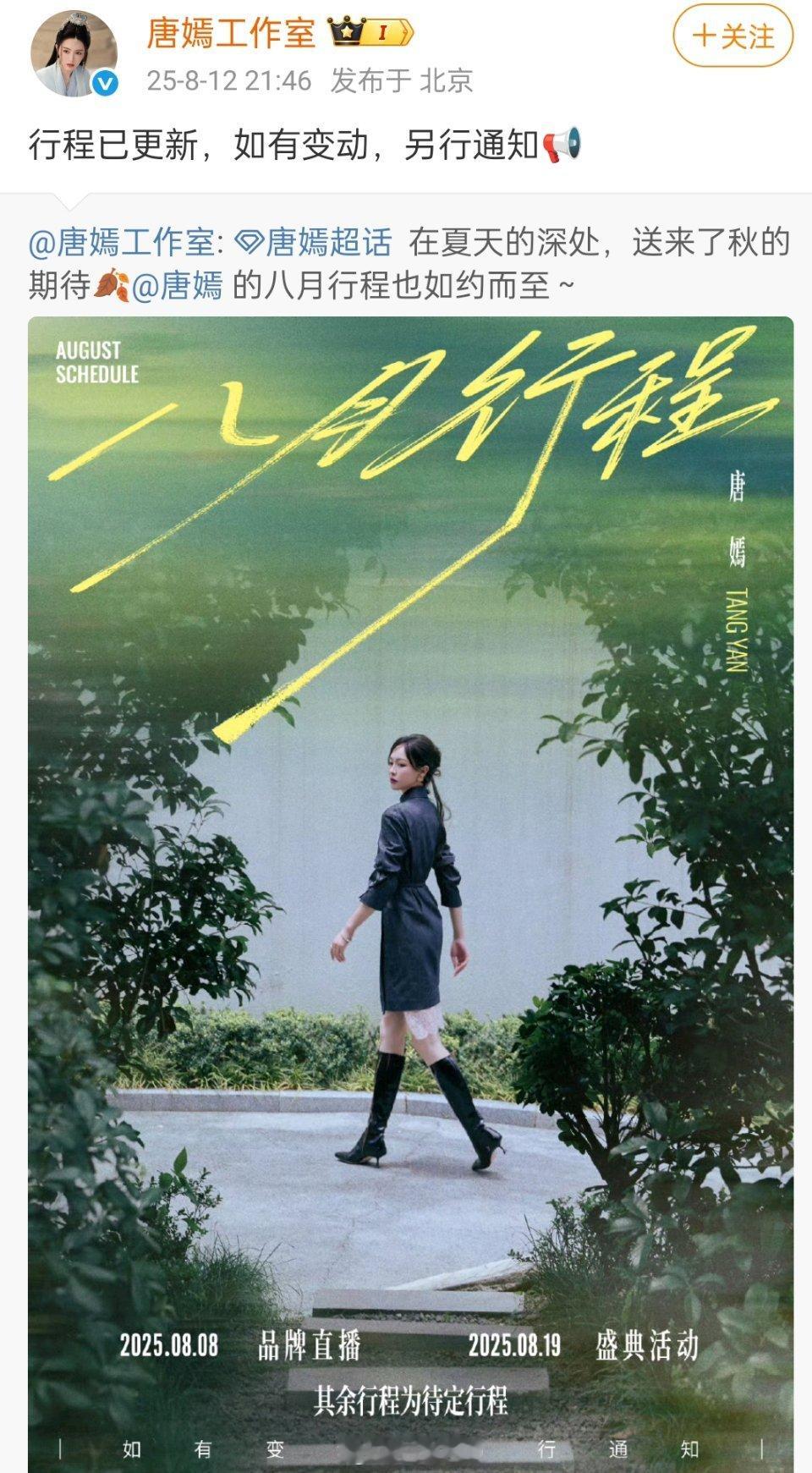 唐嫣9月行程来了,啊啊米兰时装周+晚会[爱慕]!