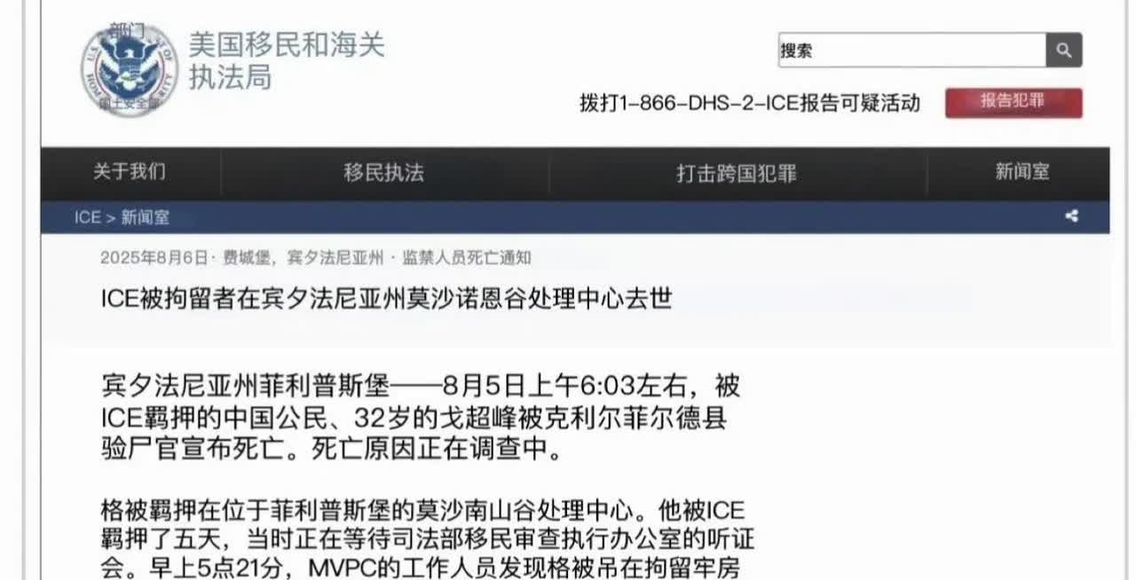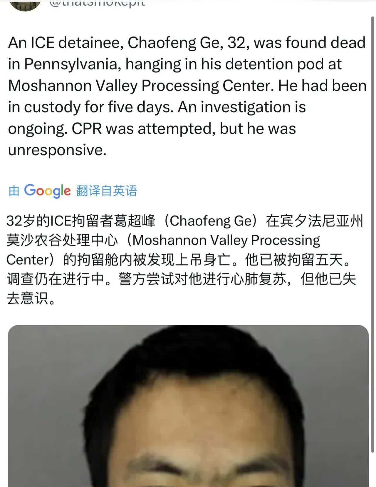 据美国移民和海关执法局 (ICE) 称,被拘留的32岁润人葛超峰(Chaofeng Ge)被发现在拘留室的淋浴室中上吊身亡。葛已被ICE 拘留五天,正等待司法部移民审查执行办公室的听证会。警方发现时尝试对他进行心肺复苏,但他已失去意识。 他留下了一封遗书,上面写着支付宝仅剩54块钱。 此人,之前还有大量盗窃信用卡行为[看]
